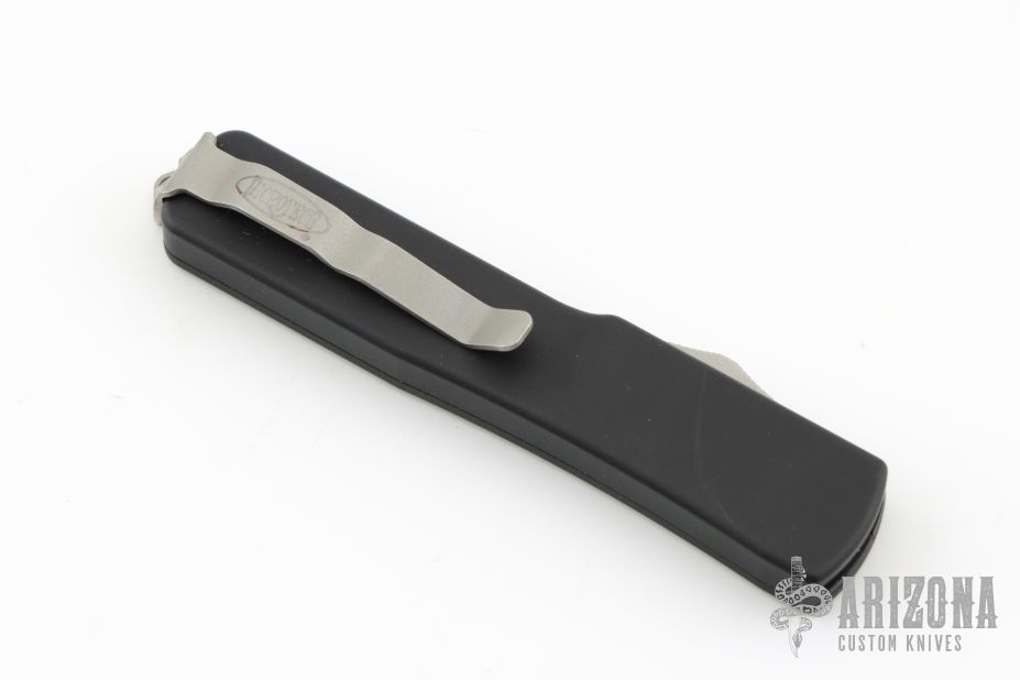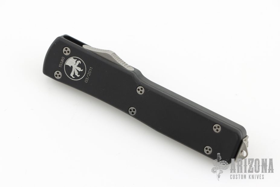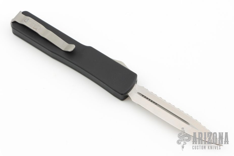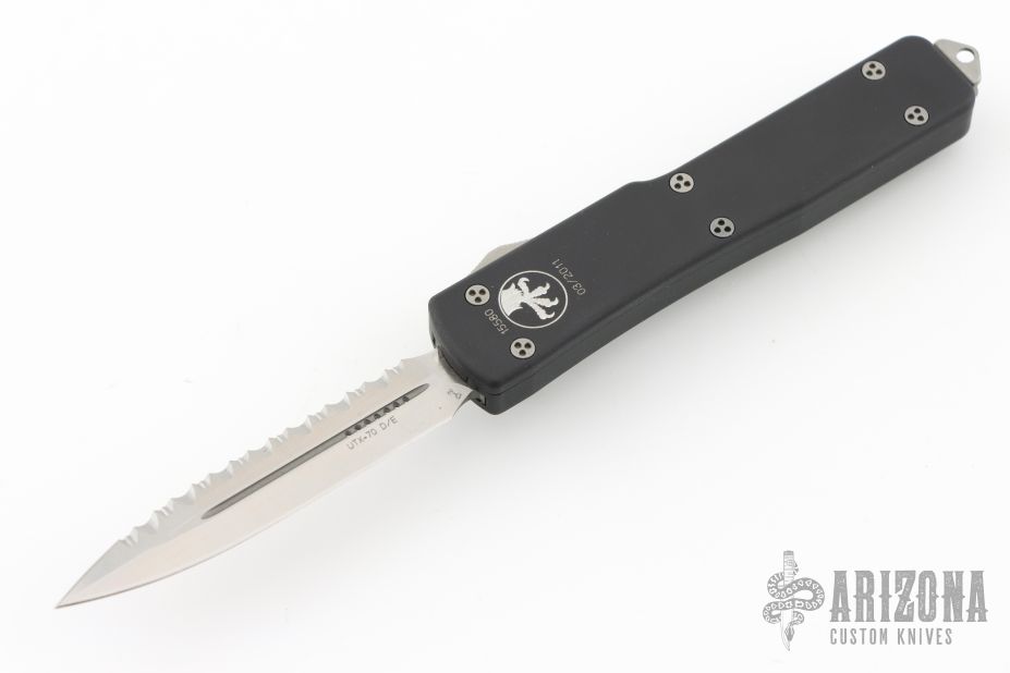 This UTX-70 OTF automatic by Microtech features a D/E satin finish blade with a full serrated edge. Black aluminum handle with a stainless steel clip. Serial number 15580 and dated 03/2011. Comes with original box, nylon belt sheath, and papers. Excellent condition.