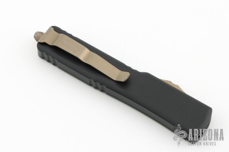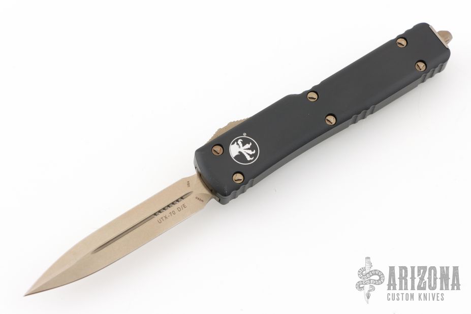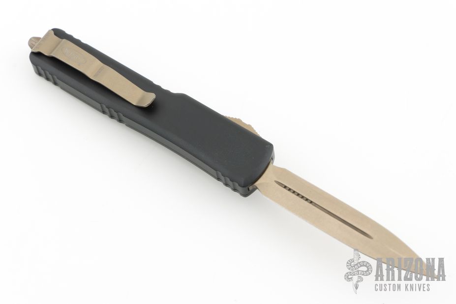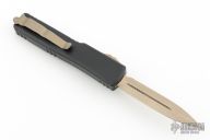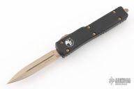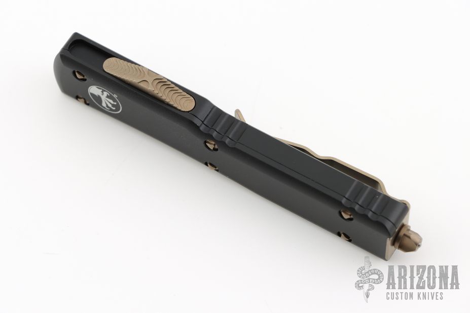 This UTX-70 OTF automatic by Microtech features a bronze finished double edged blade with fullers. The handle has a black aluminum frame with bronze stainless steel tip down clip and hardware. Serial number 38591 and dated 09/2022. Comes with original box and papers. Excellent condition.