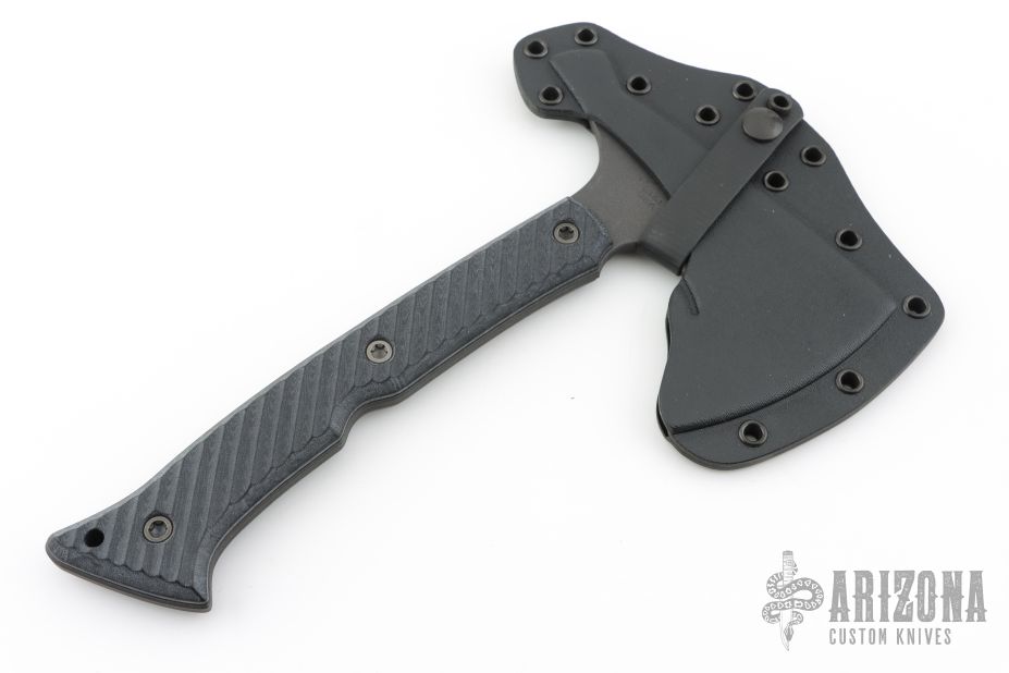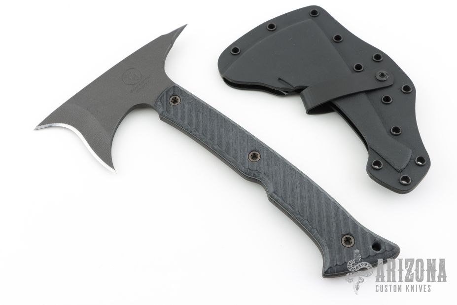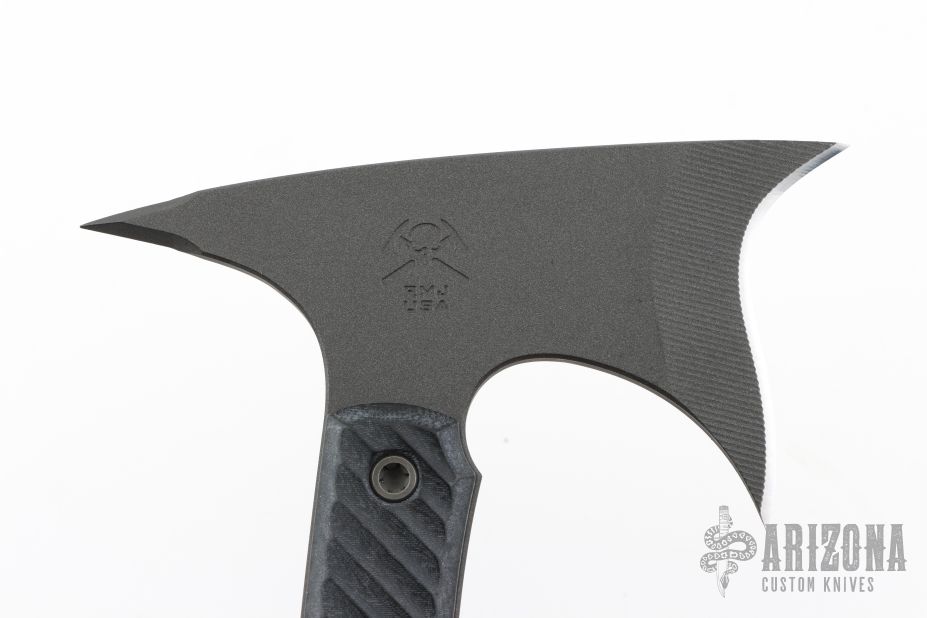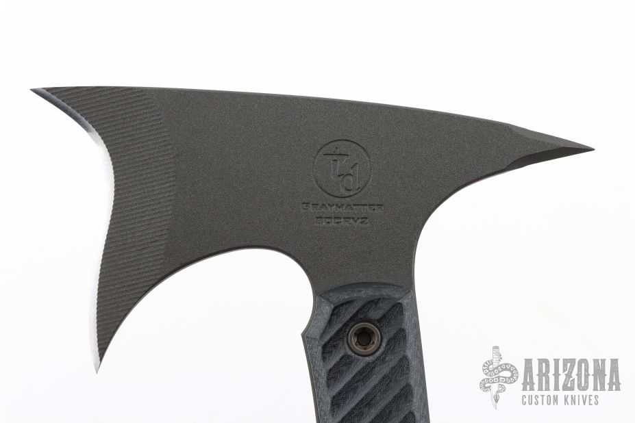 The Graymatter tomahawk offers full tang construction made from 3/16" 80CRV2 carbon steel and has a Cobalt Cerakote finish for increased corrosion and wear resistance. The aggressive head is purpose designed with defensive use in mind. The handle scales offer a contoured 3D texture that works effectively in both wet and dry environments without an overly aggressive feel. The head features a razor sharp, 3” forward facing edge, along with a wicked spike at the rear. The tomahawk includes a bottom eject scabbard with low ride MOC Straps for belt carry.