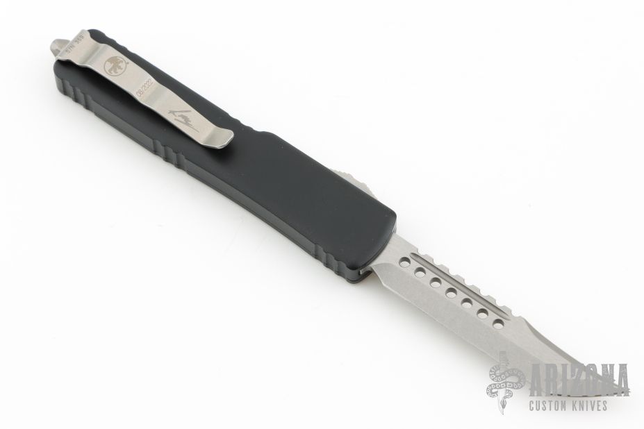 This signature series UTX-70 OTF automatic by Microtech features a stonewashed Hellhound blade. The handle has a black aluminum frame with blasted stainless steel tip down clip. Dated 08/2022 #359. Comes with original box and papers. Excellent condition.