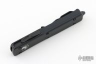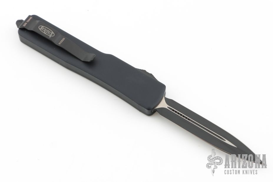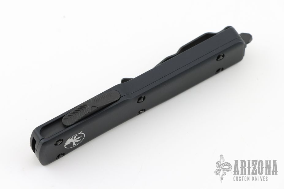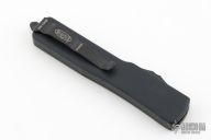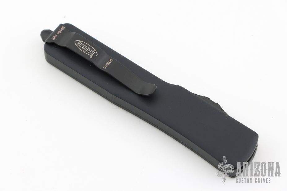 This UTX-70 OTF automatic by Microtech features a black finished blade with a standard edges. The handle has a black aluminum frame with black stainless steel tip down clip. Serial number 10446 and dated 01/2020. Comes with original box and papers. Excellent condition.