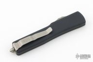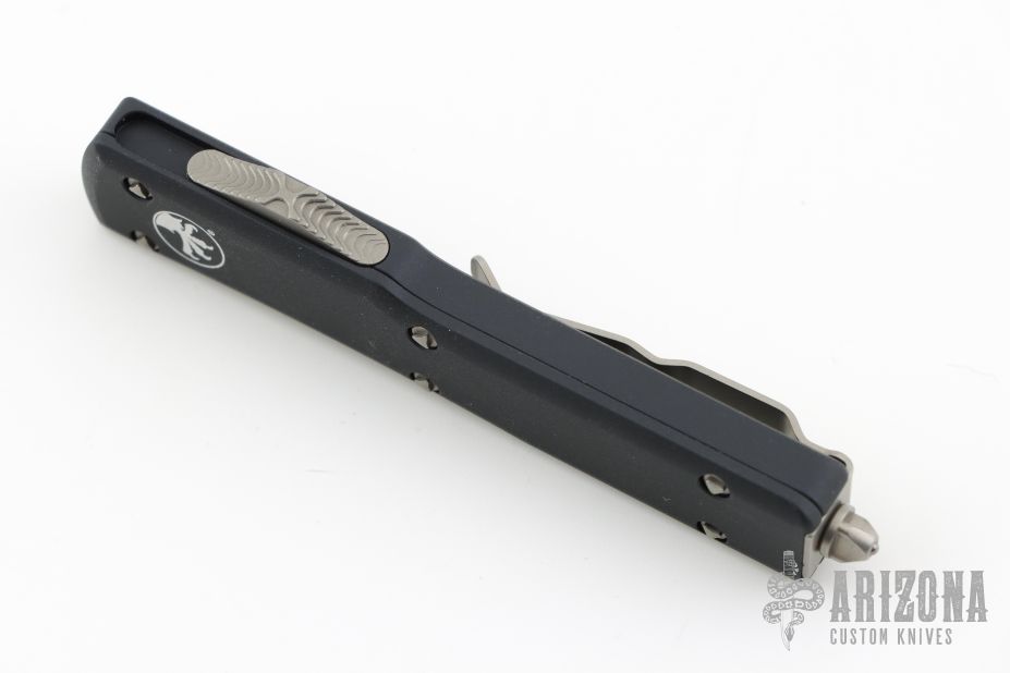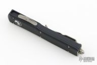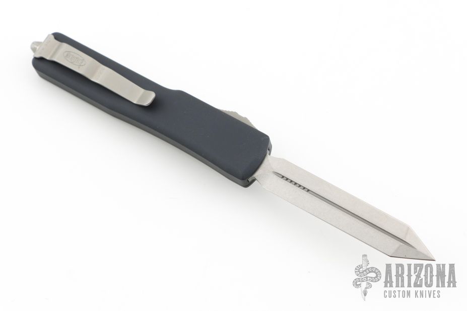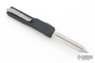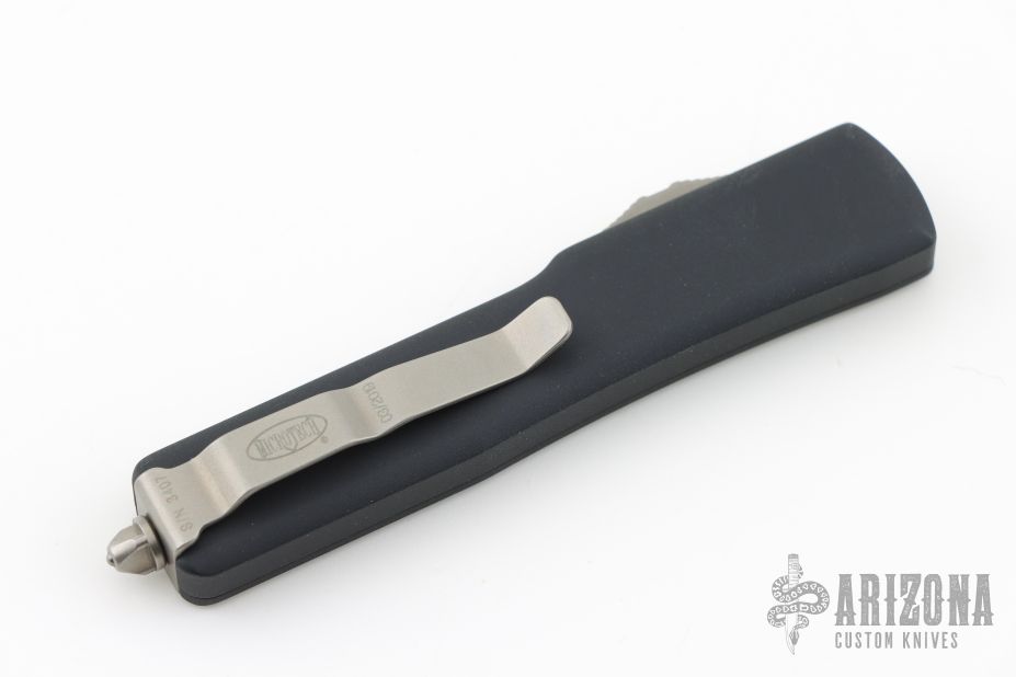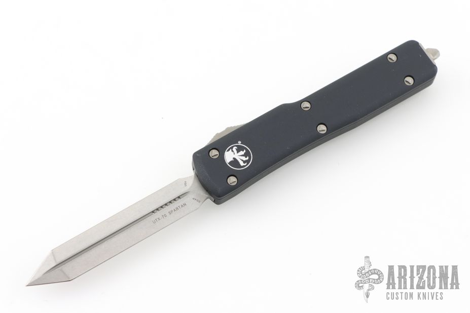 This UTX-70 OTF automatic by Microtech features a spartan stonewash finished blade with a standard edge. The handle has a black aluminum frame with blasted stainless steel tip down clip. Serial number 3047 and dated 03/2019. Comes with original box and papers. Excellent condition.