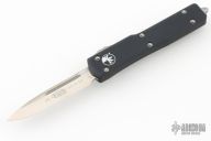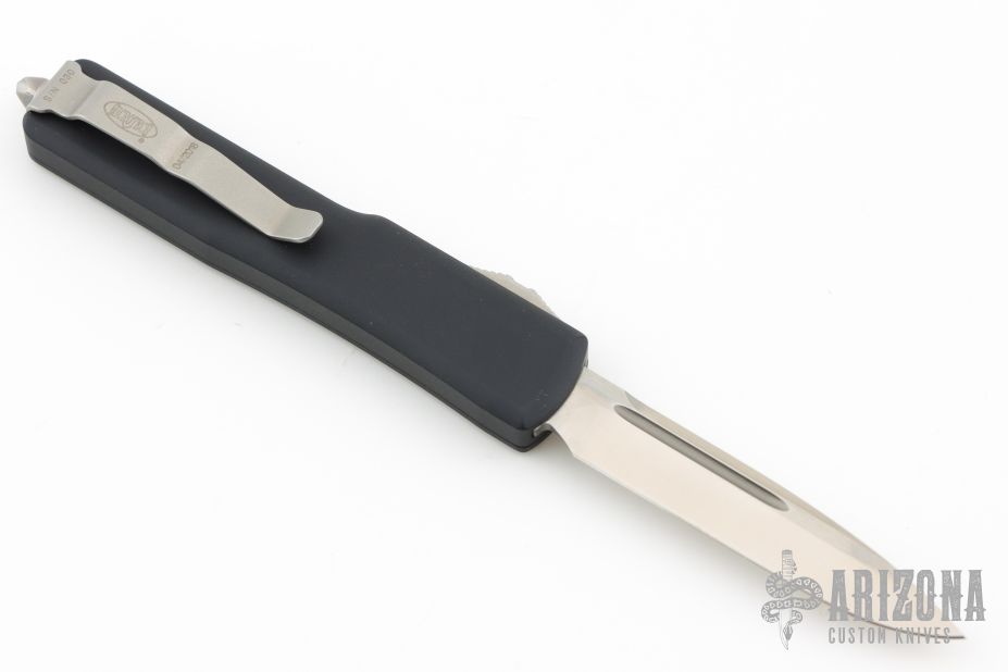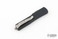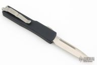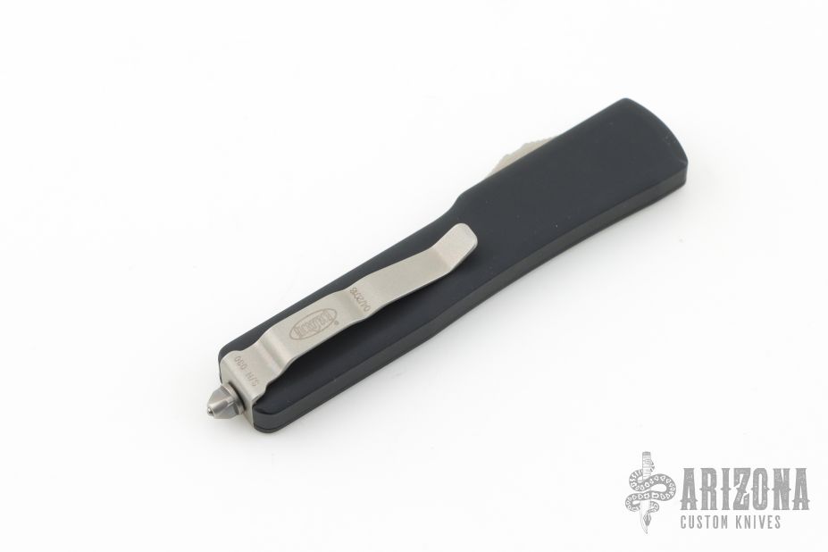 This UTX-70 OTF automatic by Microtech features a satin finished blade with a standard edge. The handle has a black aluminum frame with blasted stainless steel tip down clip. Serial number 030 and dated 04/2018. Comes with original box and papers. Excellent condition.
