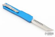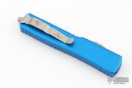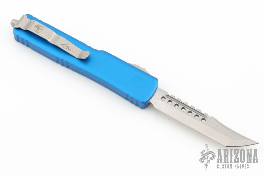 This UTX-70 OTF automatic by Microtech features a stonewashed Hellhound blade. The handle has a blue aluminum frame with blasted stainless steel tip down clip. Dated 09/2022 s/n518. Comes with original box and papers. Excellent condition.