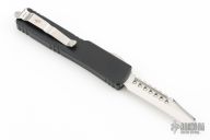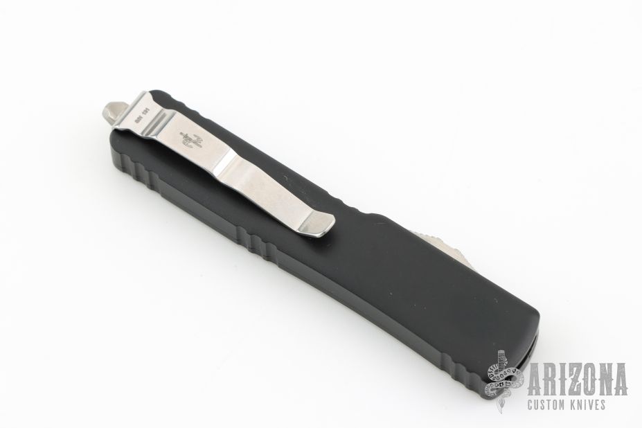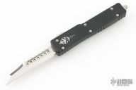 This Signature Series UTX-70 OTF automatic by Microtech features a stonewashed Warhound blade. The handle has a black aluminum frame with blasted stainless steel tip down clip. Comes with original box and papers.