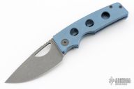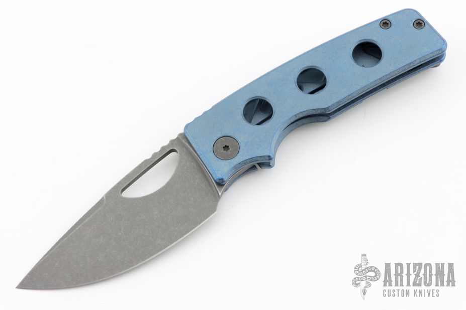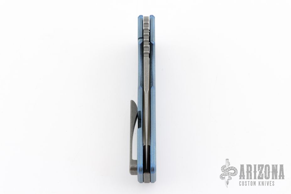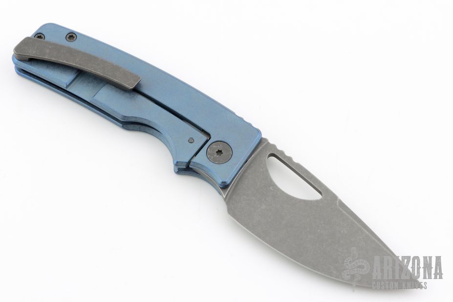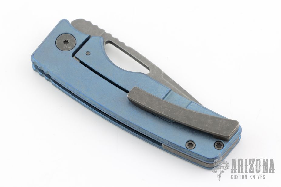 This knife by the OZ Machine Company features a tumbled Vanax blade with thumbhole and notched thumbrest. The handle features an anodized and tumbled titanium frame with speed holes, tumbled titanium backspacer and tip up pocket clip with hidden screws. Includes box and papers dated 8/26/25 and s/n 4362. Excellent condition.