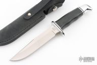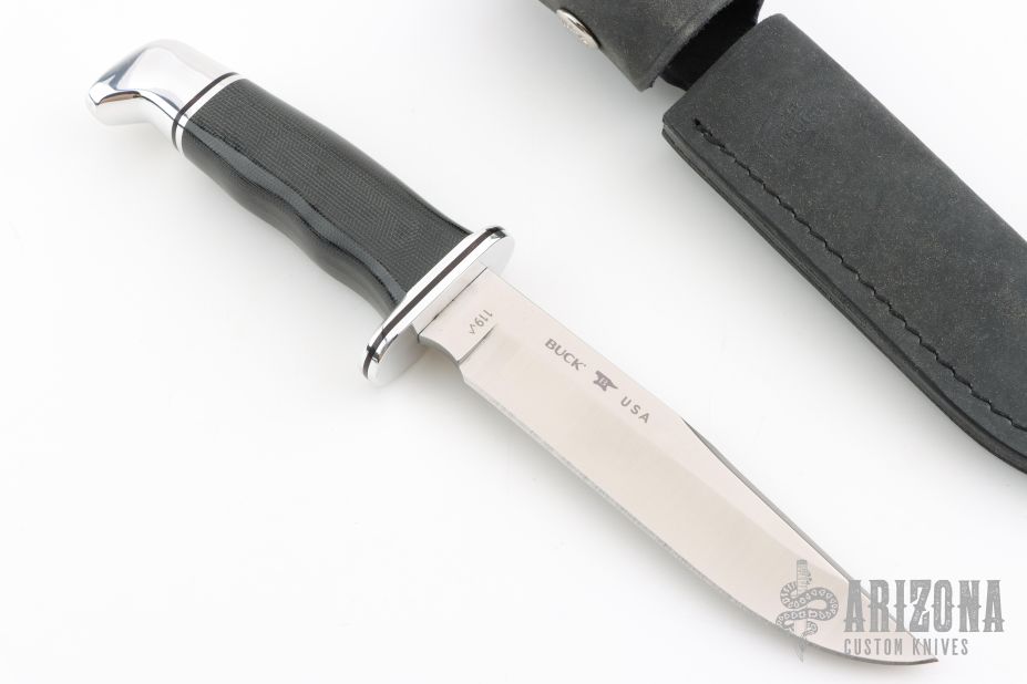 This Model 119 by Buck Knives features a satin finished clip point blade with false top edge, .177" blade stock and 1.075" blade depth, hidden tang construction. The handle has an aluminum guard and butt, and a black canvas micarta grip and spacers. Comes with original black leather sheath, box and papers. Excellent condition. One of 1000