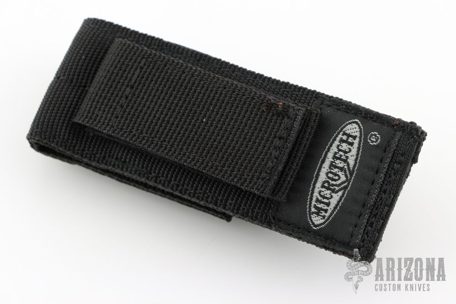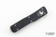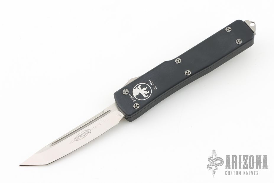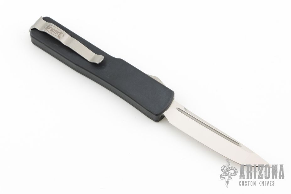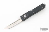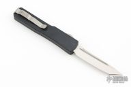 This UTX-70 OTF automatic by Microtech features a T/E satin finished blade with a standard edge. The handle has a black aluminum frame with blasted stainless steel tip down clip. Serial number 21140 and dated 01/2014. Comes with original box, nylon belt sheath, and papers. Excellent condition.