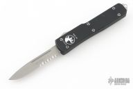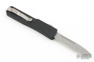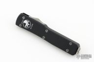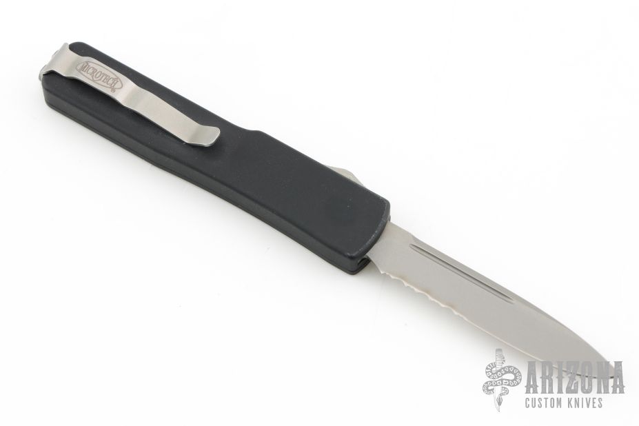 This UTX-70 OTF automatic by Microtech features a S/E bead blast finish blade with a partially serrated edge. The handle has a black aluminum frame with blasted stainless steel tip down clip. Serial number 21111 and dated 01/2014. Comes with original box and papers. Excellent condition.