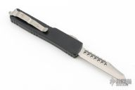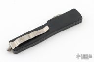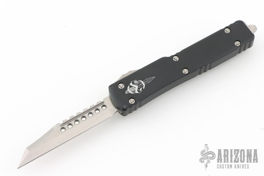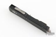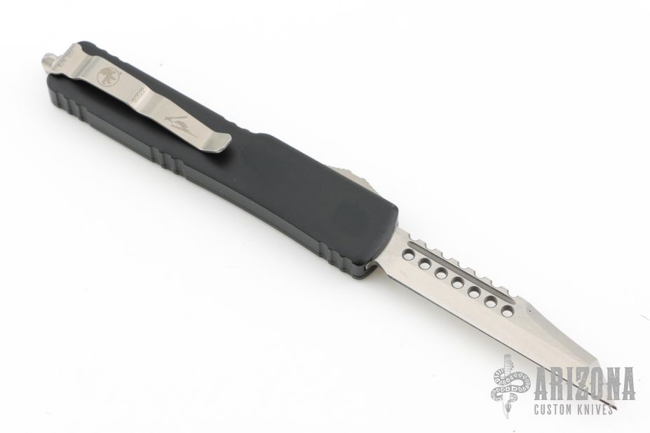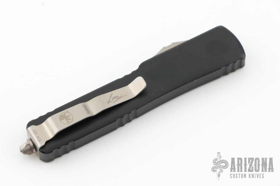 This Signature Series UTX-70 OTF automatic by Microtech features a stonewashed Warhound blade. The handle has a black aluminum frame with blasted stainless steel tip down clip. Dated 11/2022 and s/n 051. Comes with original box and papers. Excellent condition.