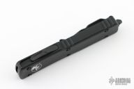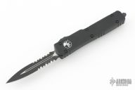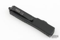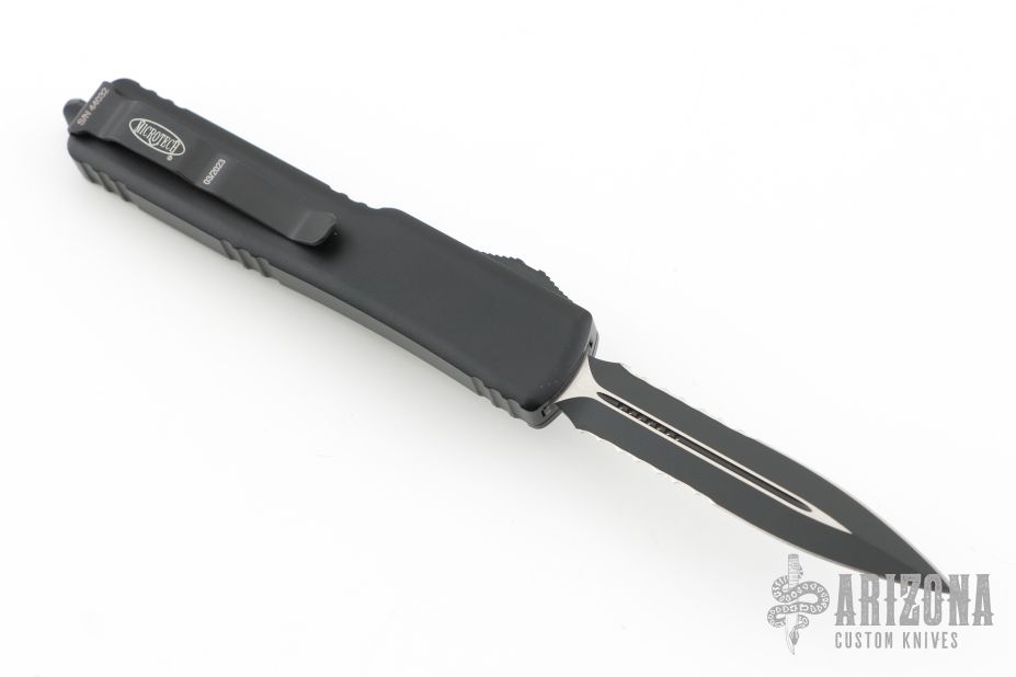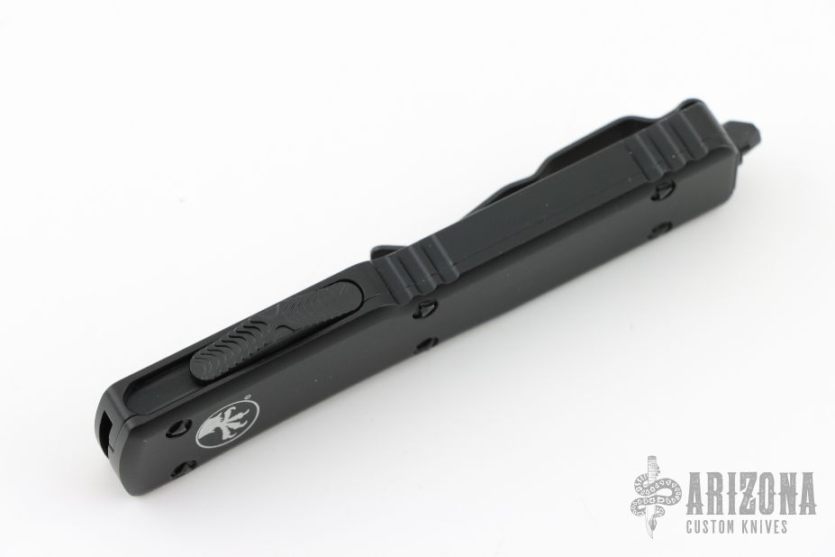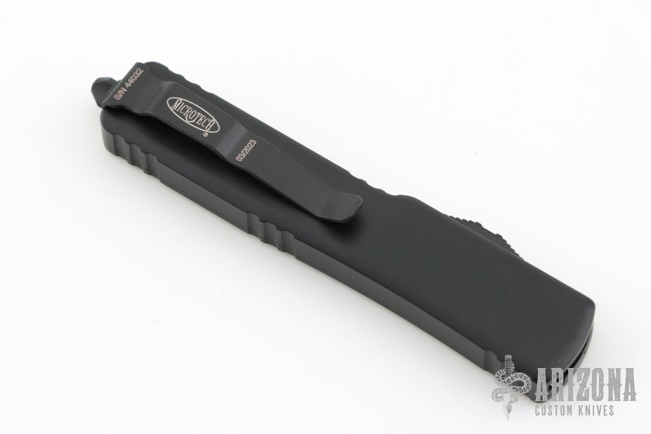 This UTX-70 OTF automatic by Microtech features a black blade with a partially serrated edges. The handle has a black aluminum frame with black stainless steel tip down clip and hardware. Serial number 44032 and dated 03/2023. Comes with original box and papers. Excellent condition.