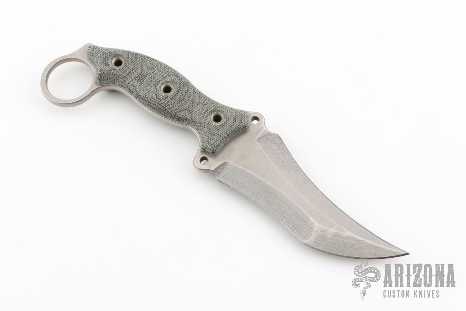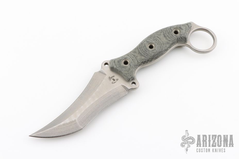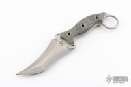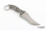 This Special Release Triceratops by Busse features a satin finished blade with sharpened top edge, .209" blade stock, 1.74" blade depth, full tang construction with black canvas micarta scales with a ring at the butt. Excellent condition.