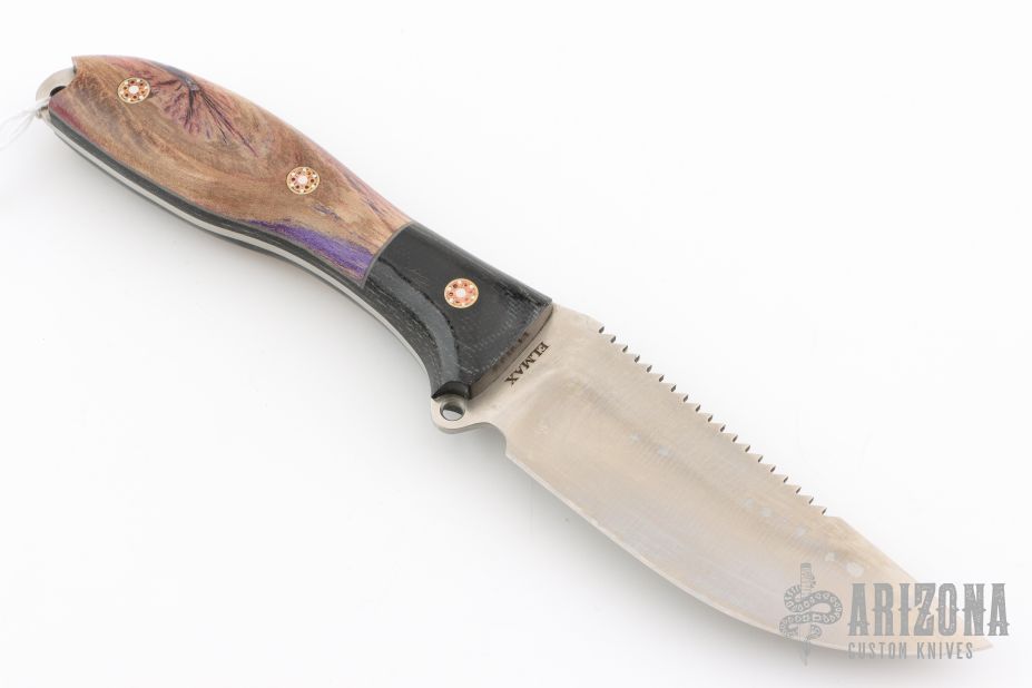 This Custom Shop Saw of Duty by the Busse features a satin finished blade with sawteeth, .089" blade stock, 1.311" blade depth, full tang construction with micarta bolsters, wood covers, mosaic pins, and a lanyard hole. Excellent condition.