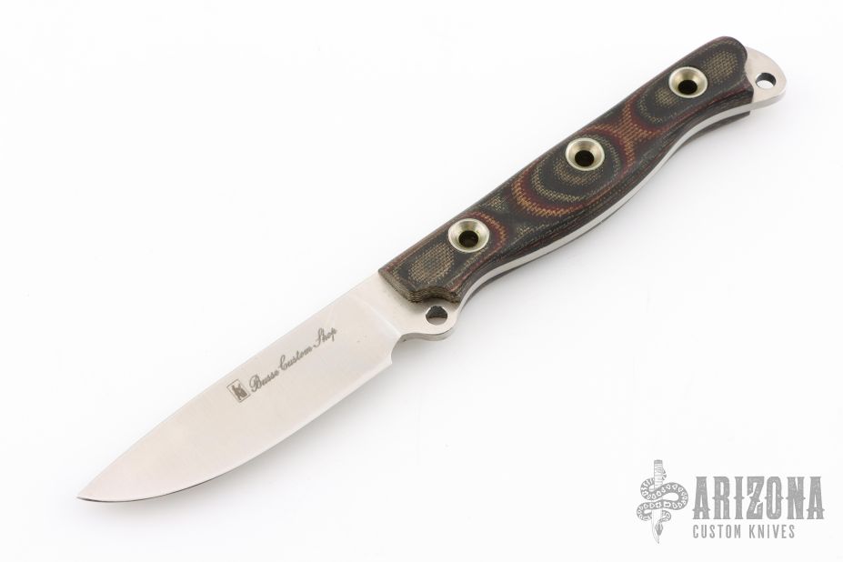 This Custom Shop Cultellus by Busse features a drop point satin finished blade, .126" blade stock and .843" blade depth, full tang construction. The handle has micarta scales, and tube pins and extended tang with lanyard hole. Excellent condition.