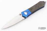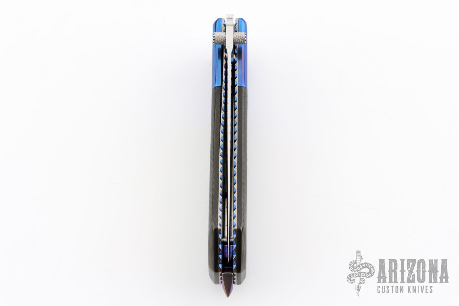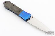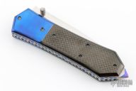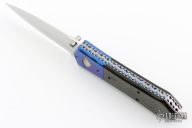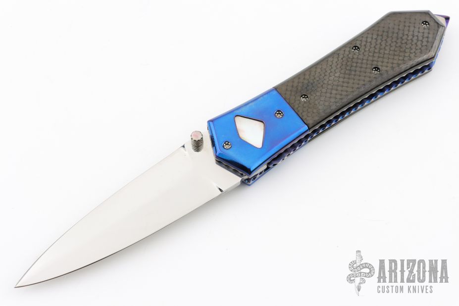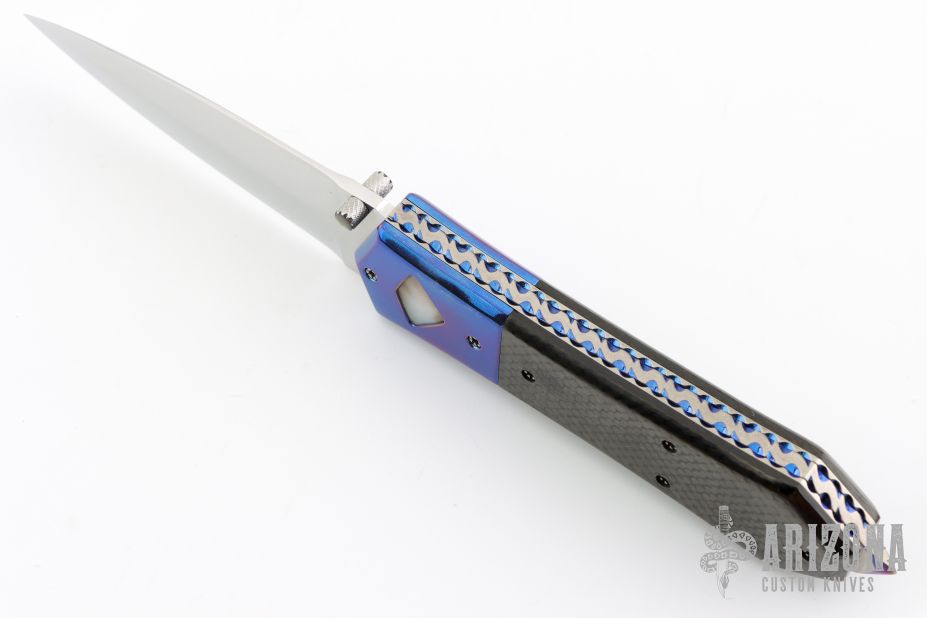 This D/A Auto by Nate Clark features a mirror polished dagger blade with dual knurled pearl inlaid thumbstuds. The handle has titanium bolsters with covert pearl push button, carbon fiber scales, polished anodized finish titanium liners with jeweled interiors, fileworked and anodized titanium backspacer with spiked tail. Nice action, lockup, detent and blade seating. Has some light scratches, excellent condition otherwise. Comes with a zippered case.
