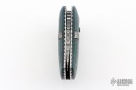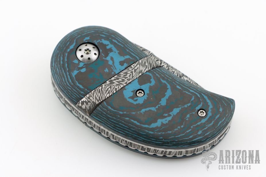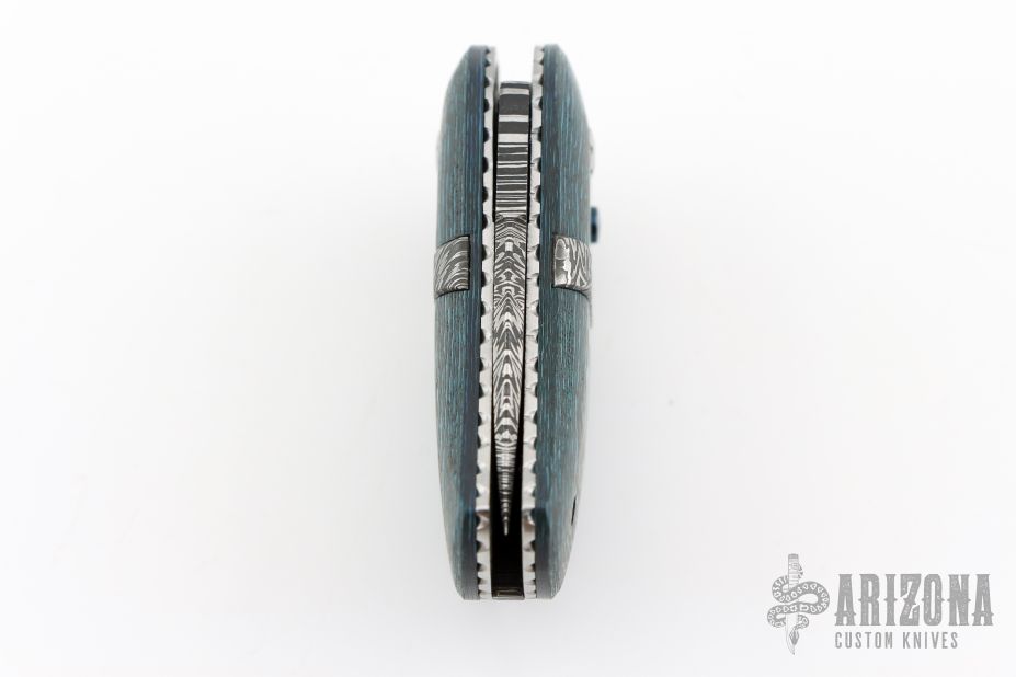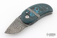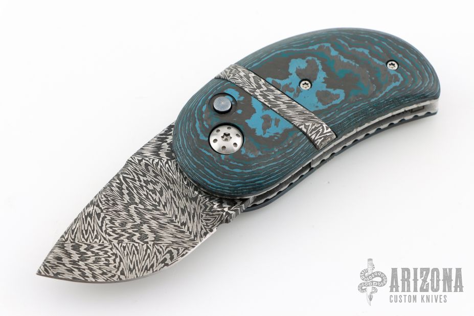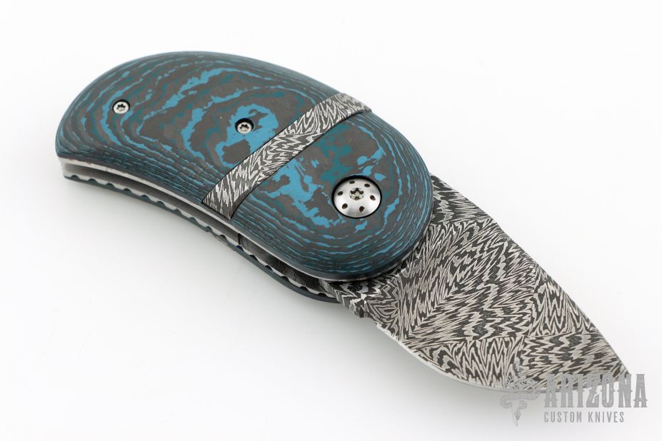 This Minnow by Phil Booth features a  Robert Eggerling Damascus blade. The handle has blue/black fat carbon fiber scales with a Damascus band, fileworked stainless steel liners, Damascus backspacer, steel push button. Nice action and blade seating. Comes with a zippered case. Excellent condition.