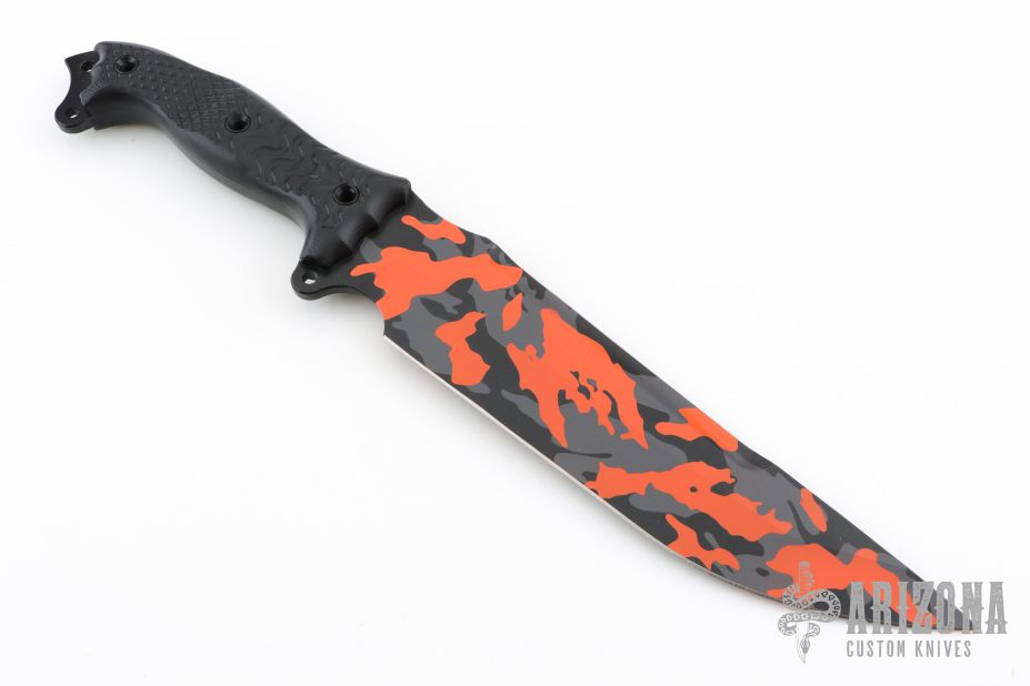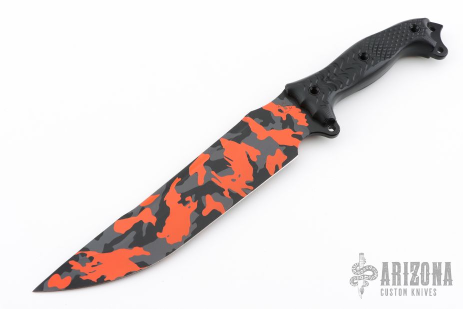 This Custom Shop Nuclear Fusion Force 9 by Busse features an orange/black/gray Multicam finished blade with sharpened top edge, .22" blade stock and 2.192" blade depth, full tang construction. The handle has black g-10 scales, extended tang with lanyard holes. Excellent condition.