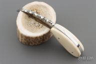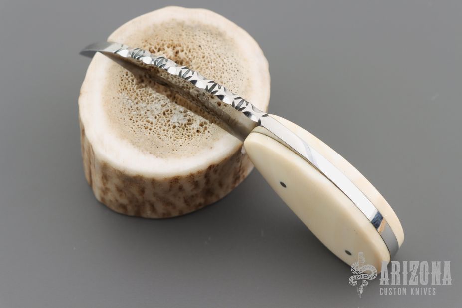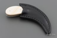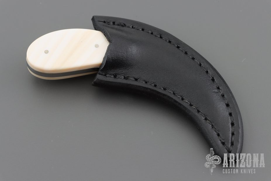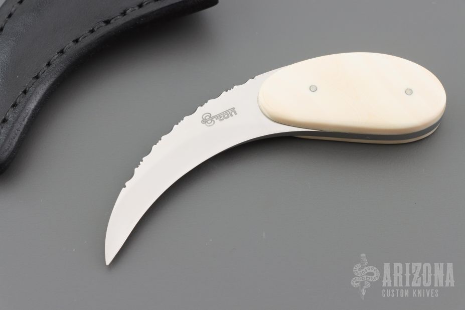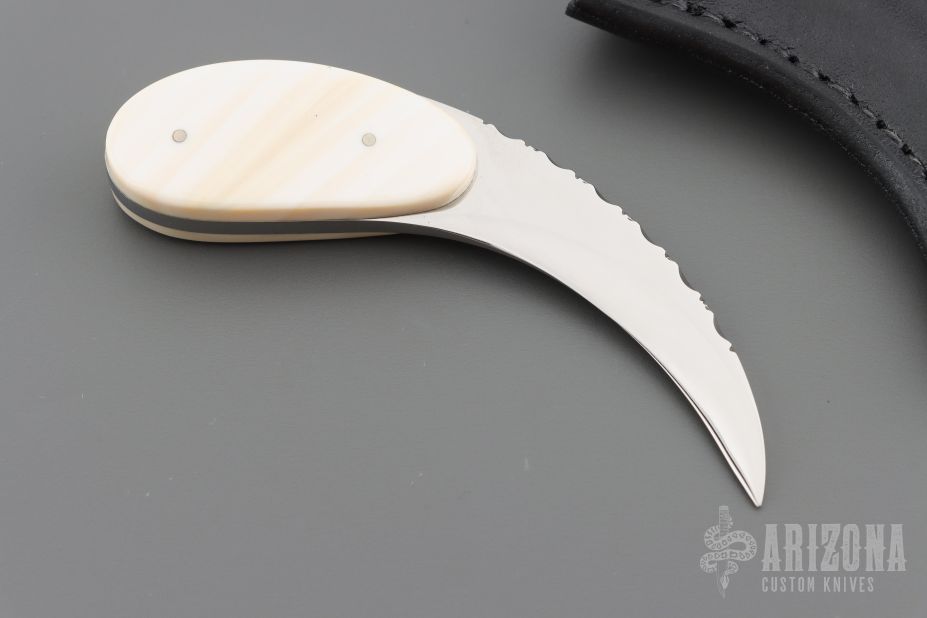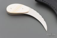 This "Regret" Bear Claw by Bill Keeton features a mirror polished hawkbill blade with fileworked spine, .125" blade stock and .596" blade depth, full tang construction. The handle has mammoth ivory scales. Comes with a black leather sheath. Excellent condition.