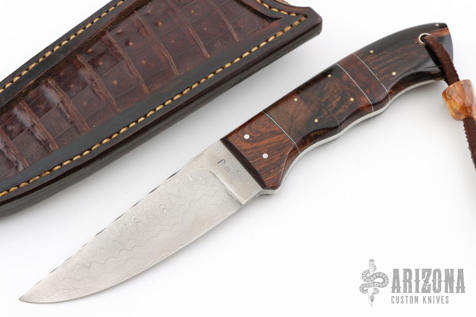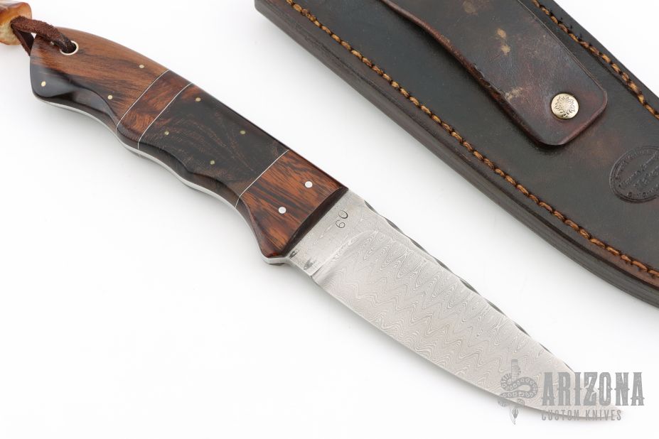 This Drop Point Hunter by Wayne Jarrett features a Damascus drop point blade with a tapered tang construction with file work along the  blade spine, .168" Blade Stock and 1.31" Blade Depth. The handle features mosaic pinned wood covers and silver spacers. Comes with a leather belt sheath. Has a few light scratches. Excellent condition.
