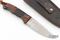 From a 2011 A.G. Russell Knife Maker Spotlight : Colorado knifemaker, Wayne Jarrett, found his love for knives when he received his first pocketknife from his dad for his 7th birthday and a stacked leather hunting knife from his brother-in-law one Christmas several years later. That was all it took and Wayne has been hooked ever since. Wayne made his first knife in 1995. He was a part-time maker until early 2009 when he decided to start making knives full-time. Wayne utilizes the stock removal method and uses only premium steels and handle material in every knife he makes. He does all of the work himself, including heat treating and tempering, nothing is ever farmed out. He makes them one at a time by hand in his Colorado shop. All of his sheaths are also handmade by Wayne, custom crafted to fit each knife. Wayne primarily makes full tang hunting and skinning knives for sportsmen, guides and outfitters. From time to time, he also makes larger bowie, camp and tactical knives as well. Wayne has customers from all over the world who use his knives for everything from cutting the bacon at the campsite to skinning out that big game catch in Africa. Wayne also has an apprenticeship program in which he is teaching young high school students the art of making hand made knives. His current student is CJ, an 18 year old young man who has a passion for knives and drive to know more about them. Wayne is also a member of the Professional Knifemakers Association. You can view more of Wayne’s knives by visiting his website at www.jarrettknives.com. Some of CJ’s knives can also be viewed on Wayne’s website if you would like to see how good of a teacher Wayne is. If you can’t find Wayne in his shop hard at work making knives, you might find him out on Gold Medal streams in Colorado enjoying his other love…fly fishing.