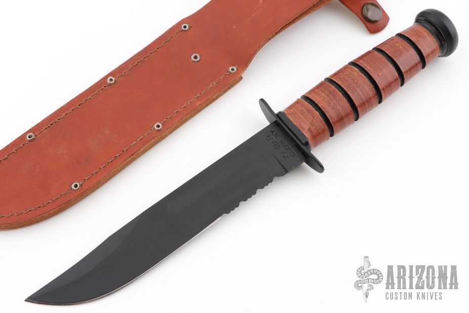 This KA-BAR USMC Fighting Knife has a carbon steel black clip point blade, with partial serrations, marked "KA-BAR/ Olean, NY USMC", and steel double guard. Blade stock is .174", depth 1.233". Handle is stacked leather with a 3/8" pinned butt cap. Includes brown leather sheath with belt loop. Has a couple lights scuffs. Excellent condition.