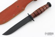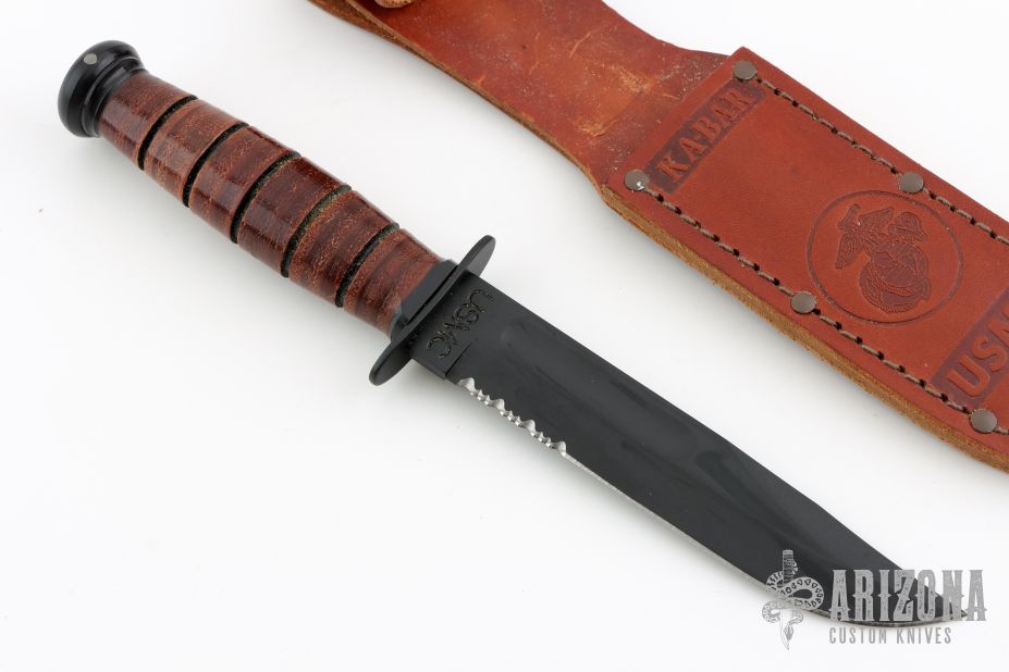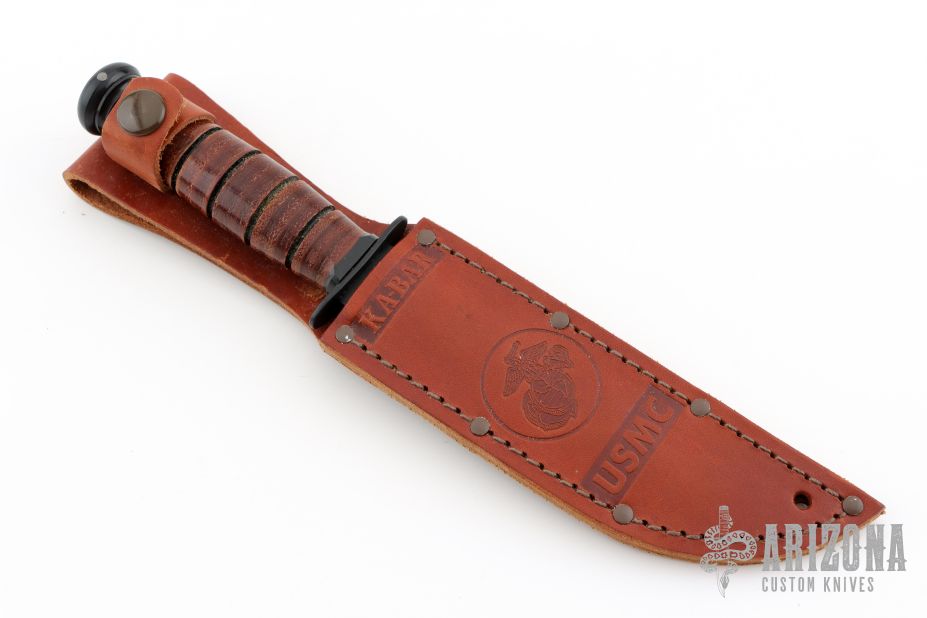 This KA-BAR USMC Fighting Knife has a carbon steel black clip point blade with false top edge, partial serrations, marked "KA-BAR/ Olean, NY USMC", and steel double guard. Blade stock is .174", depth .977". Handle is stacked leather with a 3/8" pinned butt cap. Has a couple light scuffs, otherwise Excellent condition. Includes leather sheath.