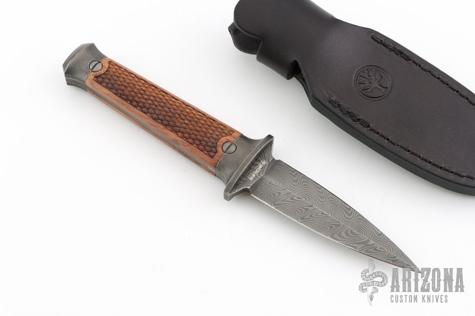 The Boker P08-Damascus not only incorporates various design elements of the unusually aesthetic official weapon, but is also equipped with a unique damascus blade made of the barrel steel of the precise pistol. The remarkable damascus is forged for us by Chad Nichols by hand in the Boomerang pattern. The handle scales of the likewise compactly built boot dagger are made of certified imported rosewood and are reminiscent of the classic, simple checkering of the characteristic pistol grip. The same construction of the retaining screws is used to mount these handle scales as on the P08. And the cone of the exposed barrel is also found in the angle of the handle sides.