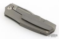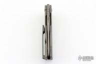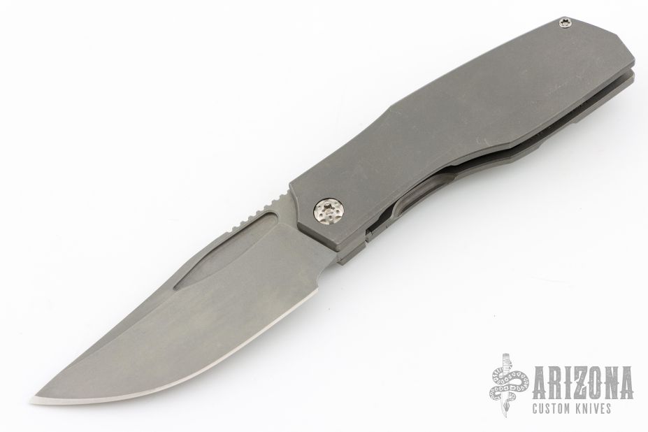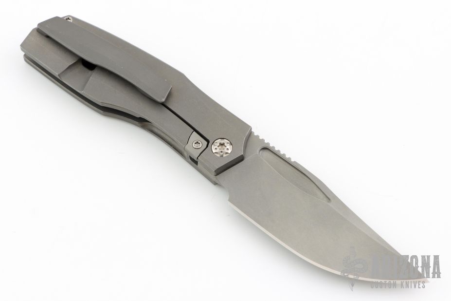 This Protean by Prince Customs is #101. It has a stonewashed blade with thumb groove and notched thumbrest. The handle has a stonewashed and milled titanium frame with matching tip up clip and floating backspacer. Stainless lockface insert. Comes with original box and COA dated 7/2024. Has a few light scuffs and scratches, otherwise great condition.