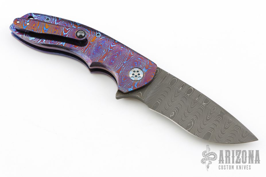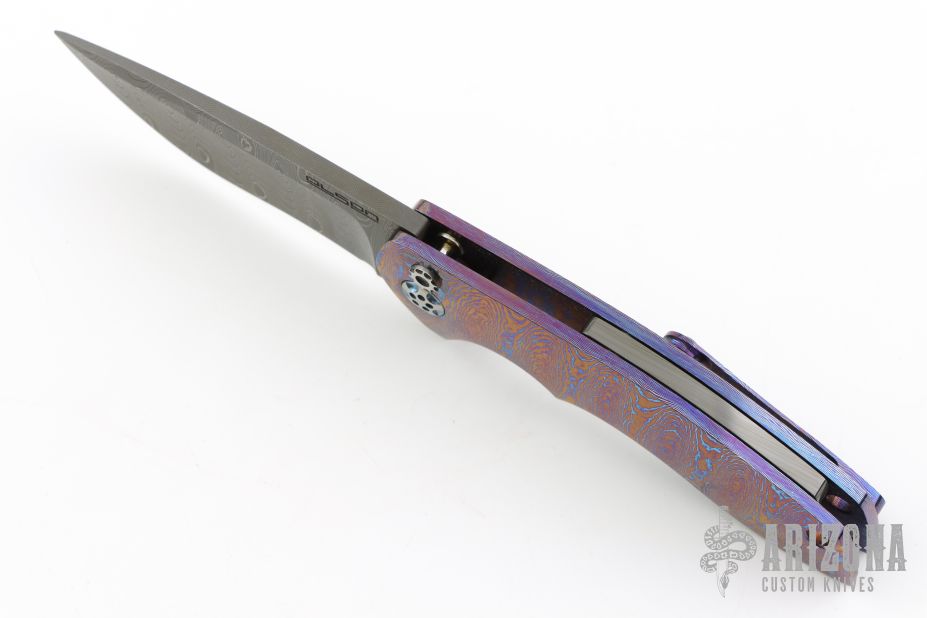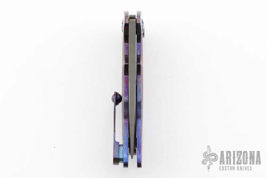 This JV Gemini 3 by Rod Olson features a darkend Thomas Damascus recurve blade with flipper. The handle has a Timascus body, Timascus tip up clip, and floating zirconium backstrap. Very well done. Rides on bearings, nice detent, lockup and blade seating. Has a couple light scratches, excellent condition otherwise.