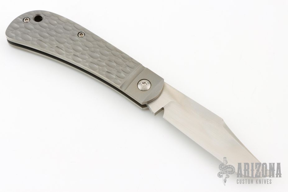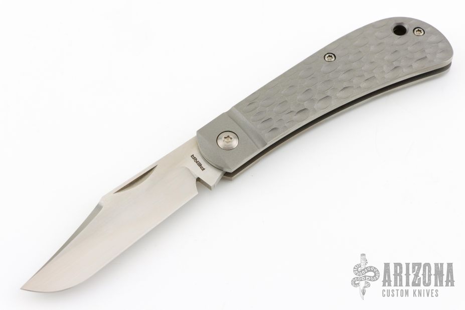 This Lanny's Clip from Enrique Pena features a satin finished blade with nail nick. The handle scales are jigged titanium. Very smooth action. The spring is flush in the closed, half stop, and open position. Impeccable fit and finish. This is a gorgeous variation of the traditional slipjoint in excellent condition.