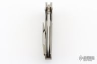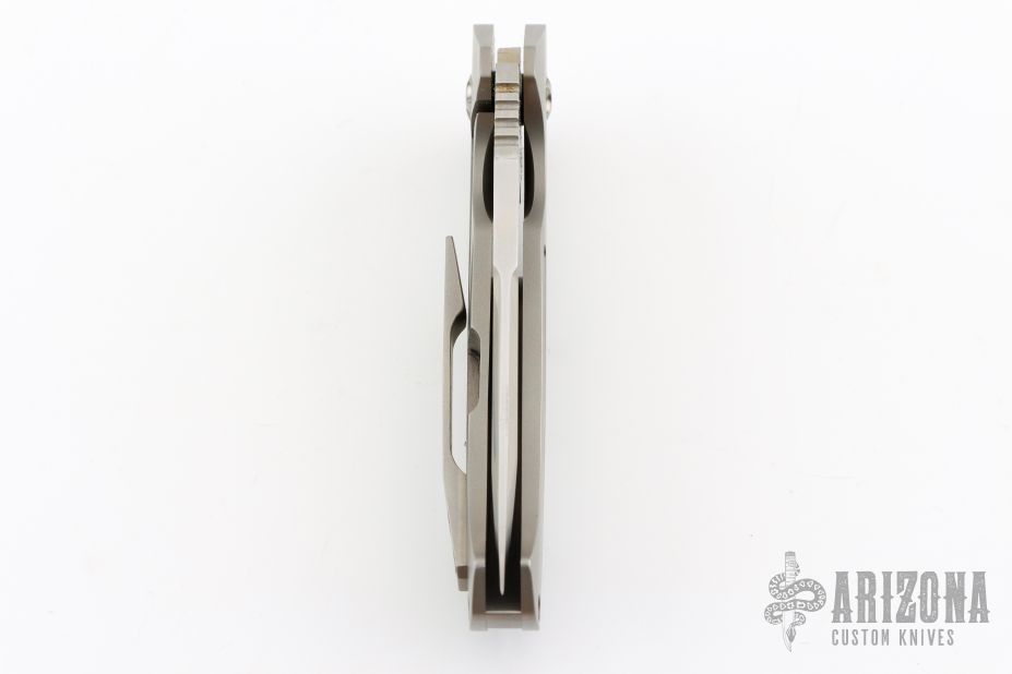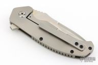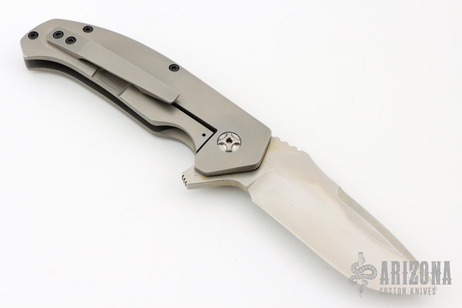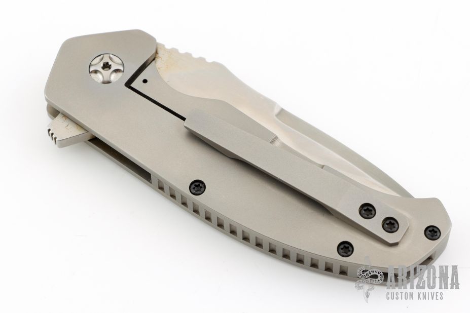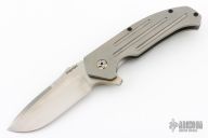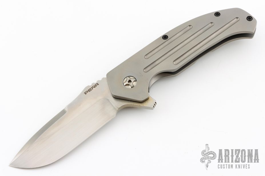 This Diesel Flipper by Enrique Pena features a hand rub satin finished drop point blade with swedge, notched thumb ramp and flipper. The handle is comprised of a titanium frame with matching tip up clip and backspacer. Excellent condition.