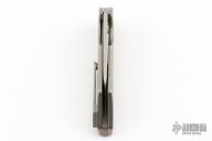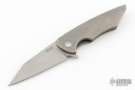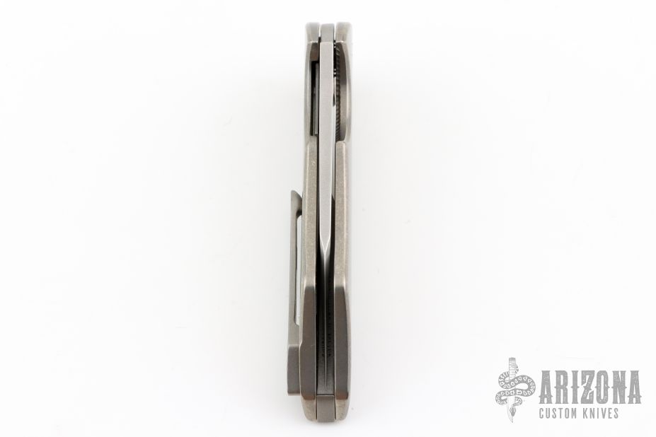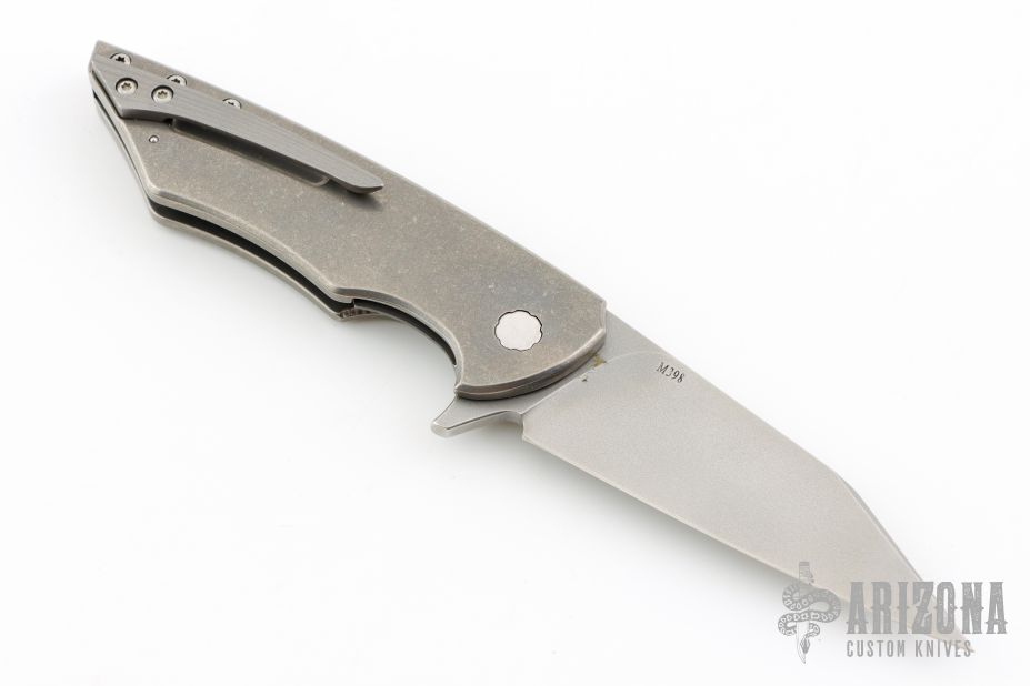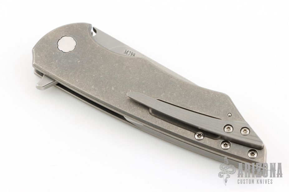This Vespertilio Flipper by Herman Knives features a tumbled blade with flipper. The handle has a tumbled titanium frame, titanium liner, and tip up titanium clip and backspacer. Nice detent, lockup and blade seating. Rides on bearings. Excellent condition. Comes with COA.
