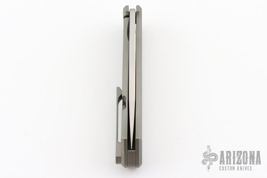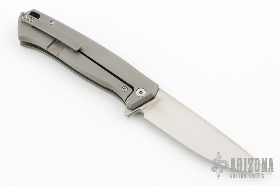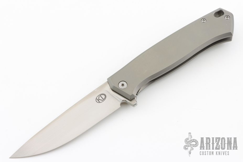 This Arsen framelock flipper by KD Knives features a hand rub satin finished blade with a flipper. The handle has a bead blasted titanium frame with a matching backspacer and tip up clip. Rides on bearings, nice detent, lockup and blade seating. Comes with COA. Has a couple light scratches, otherwise Excellent condition.