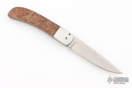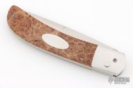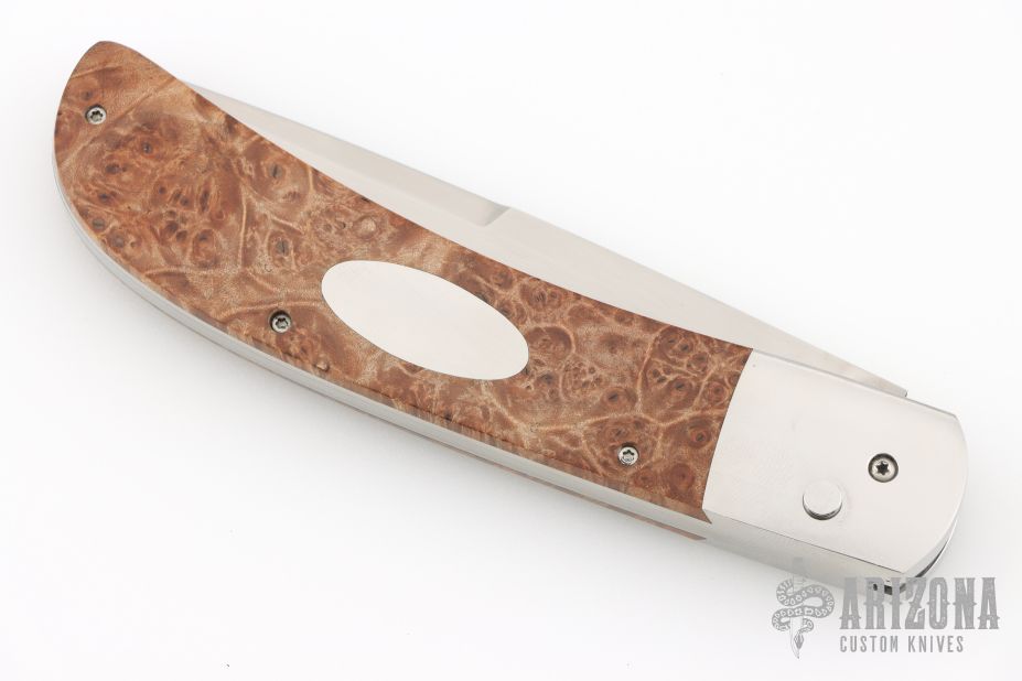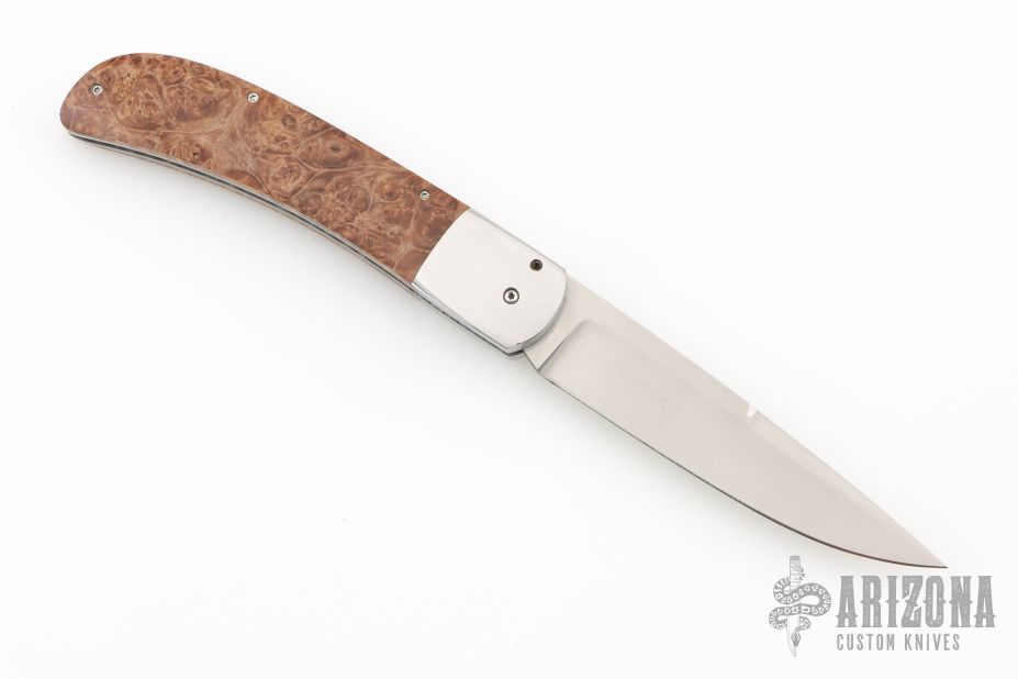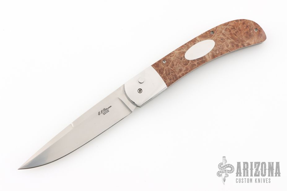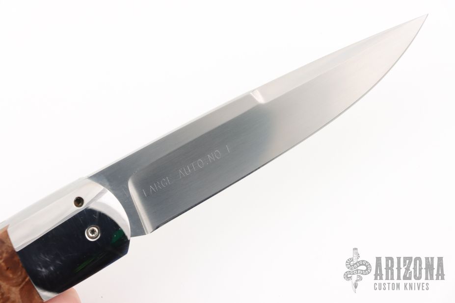 This Large Auto No.1 by Eldon Peterson features a hand rub satin finished blade with false top edge. The handle has dovetailed and polished stainless steel bolsters, maple burl scales with a polished stainless steel escutcheon, stainless steel liners and backspacer. Nice action, lockup and blade seating. Comes with a zippered case. Has a few light scratches, otherwise excellent condition.