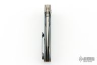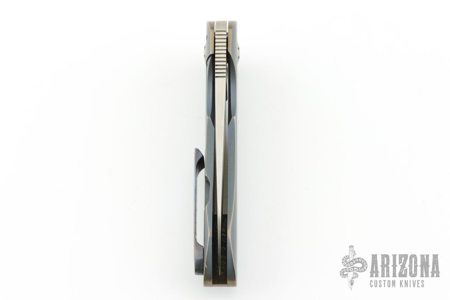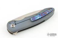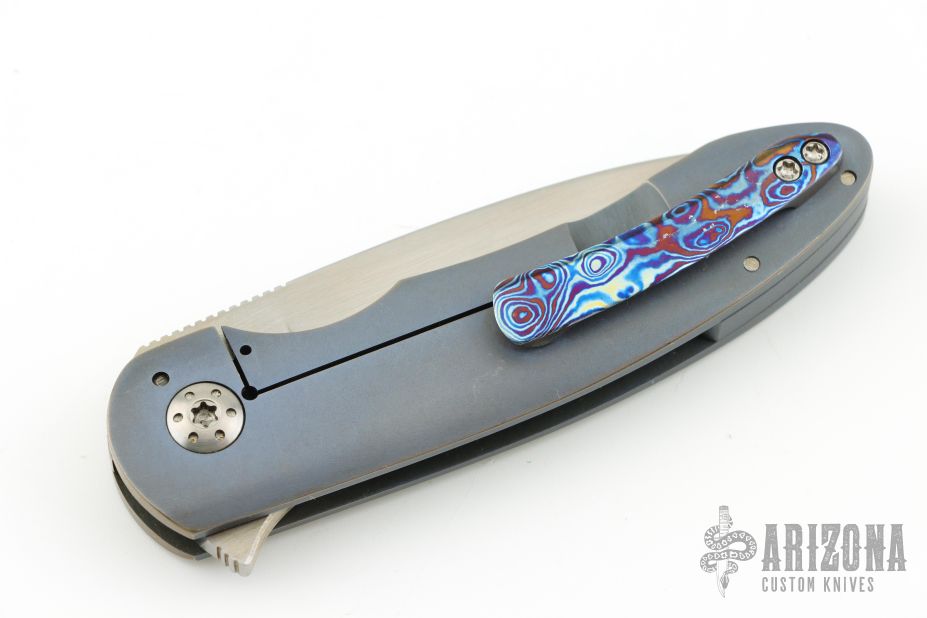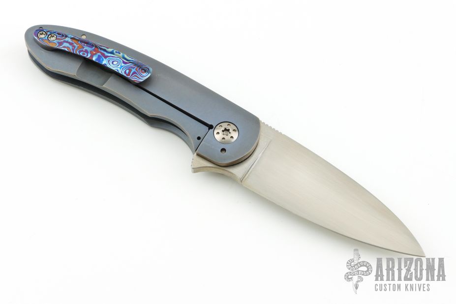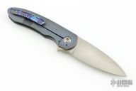 This Flipper by David Clark features a hand rub satin finished drop point blade with notched thumbrest and flipper. The handle has a tumble and andozied finish titanium frame with a Timacus tip up clip. Satin finished hardware, and matching backstrap. Nice detent, lockup and blade seating. Has a couple light scratches, otherwise Excellent condition.