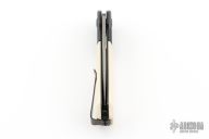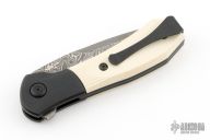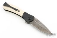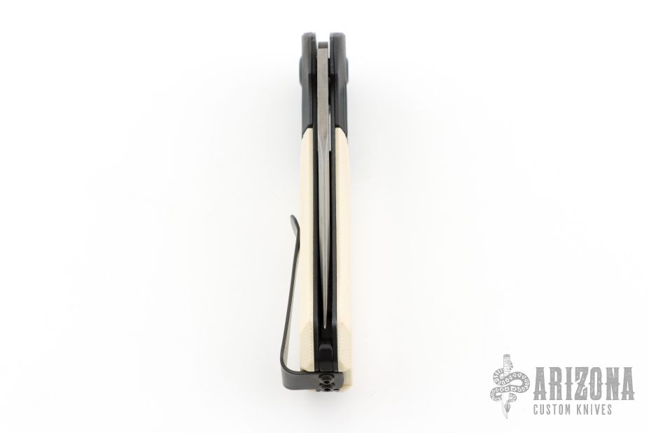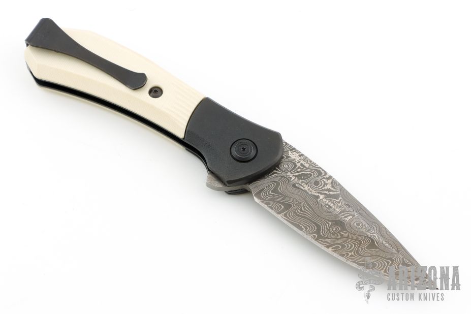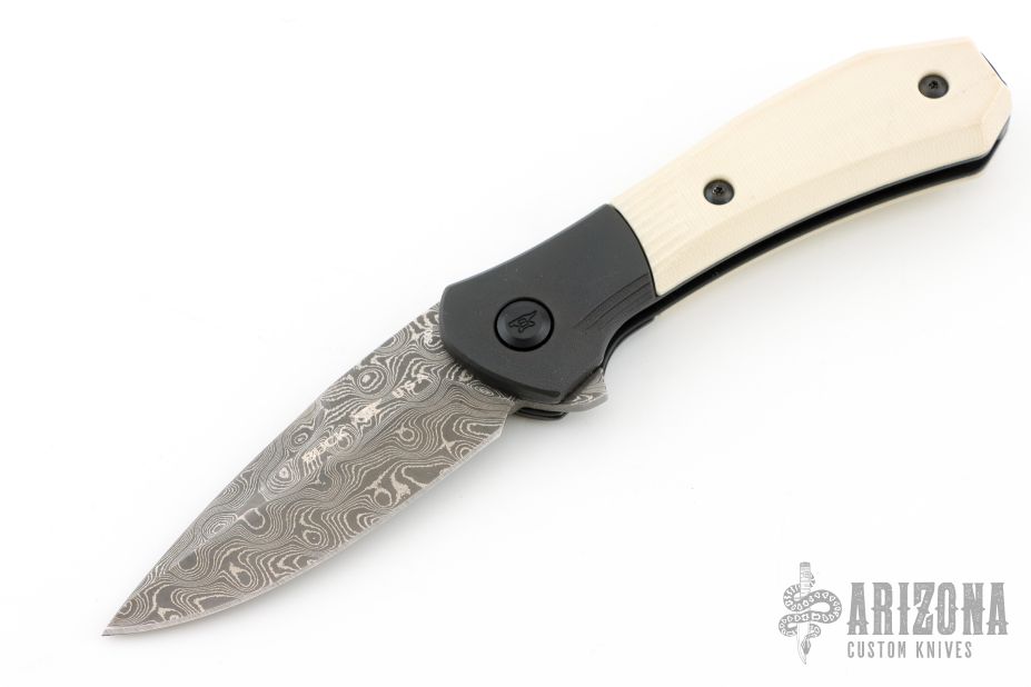 This Paradigm from Buck Knives has a drop point blade crafted from stainless steel rain drop Damascus. The handle is comprised of DLC coated stainless steel bolsters and Ivory G-10 scales over stainless steel liners and backspacer. Right/Left Hand tip up stainless steel pocket clip. This unique locking mechanism requires you to swivel the presentation side bolster backwards to both flip and close the spring assisted blade. Comes with original box and papers. Excellent condition.