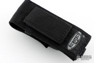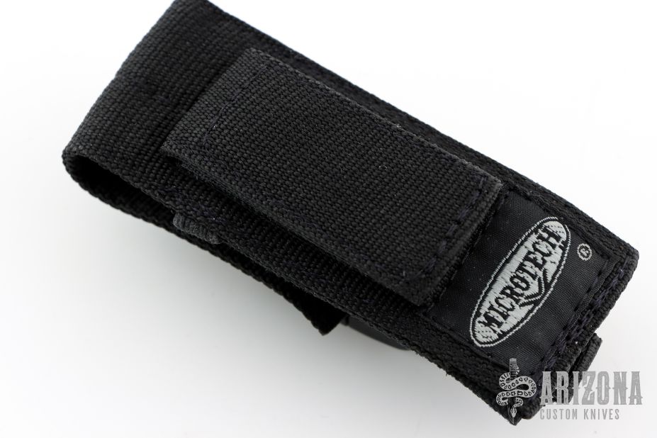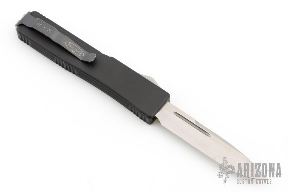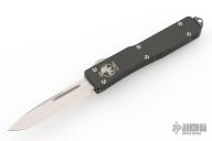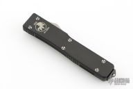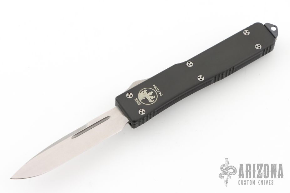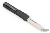 This UTX-70 OTF automatic by Microtech features a stonewash finished blade with a standard edge. The handle has a black aluminum frame with blasted stainless steel tip down clip. Serial number 0352 and dated 04/2004. Comes with original box, papers and sheath. Excellent condition.