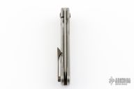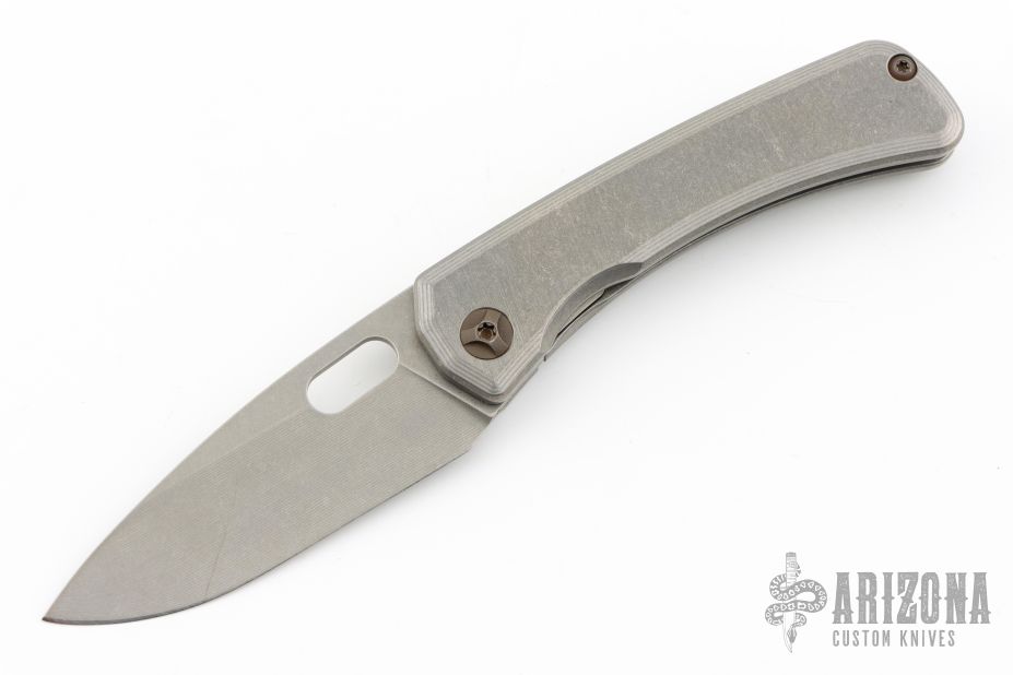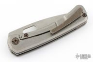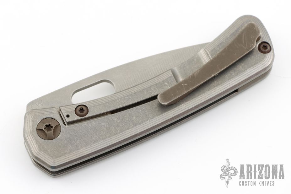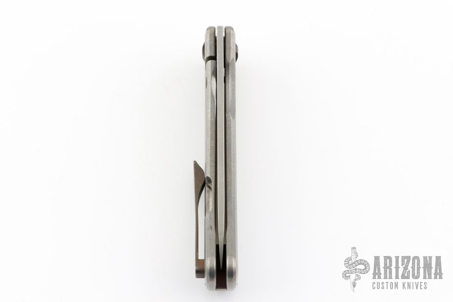 This Lamia by SPK Unlimited features a stonewashed blade with thumbhole. The handle has a milled titanium frame with darkened hardware, backspacer and tip up clip with hidden screws. Comes with COA. Has some scratches on the clip and body. Great overall condition.