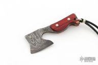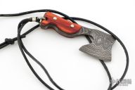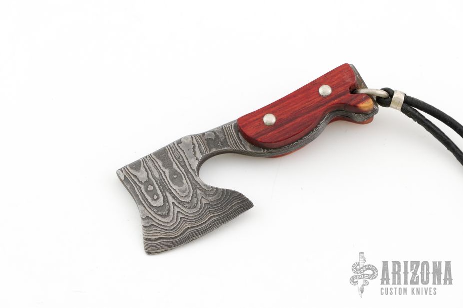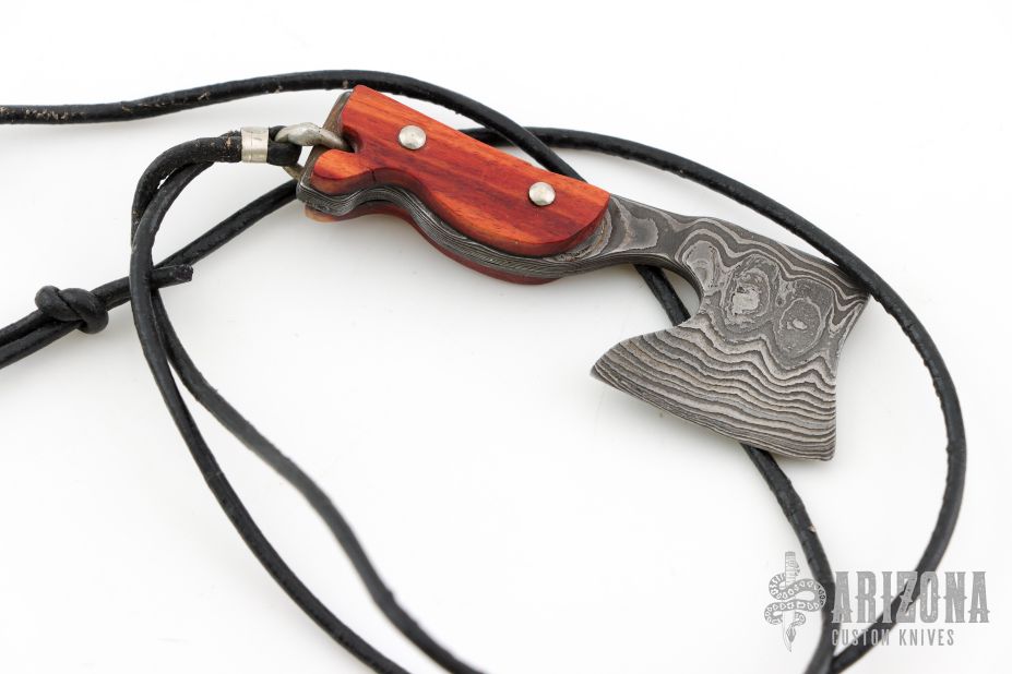 This Damascus Axe Pendent by Jeffrey E Driscoll features an Alabama Damascus "Redneck Skin" Damascus blade and tang with tulip scales with domed nickel silver pins. Comes hung on a leather necklace. New from maker!