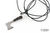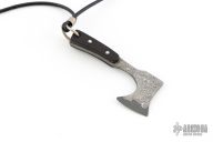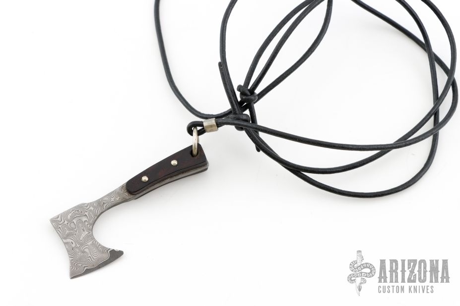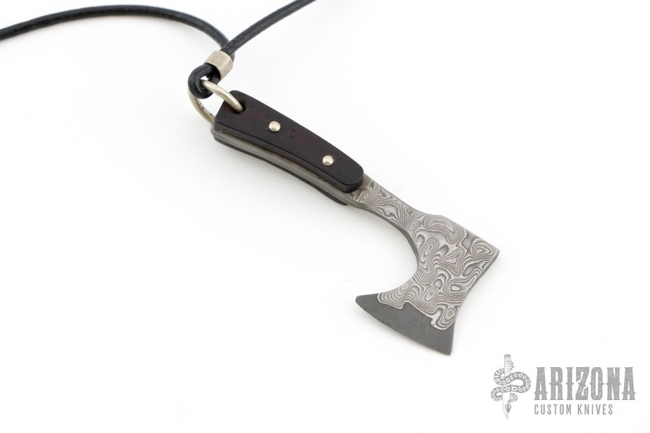 This Damascus Axe Pendent by Jeffrey E Driscoll features a VG-10 Core San Mai Damascus blade and tang with ebony scales with domed nickel silver pins. Comes hung on a leather necklace. New from maker!