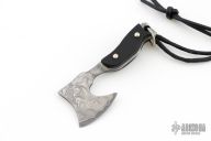 This Damascus Axe Pendent by Jeffrey E Driscoll features a VG-10 Core San Mai Damascus blade and tang with ebony scales with domed nickel silver pins. Comes hung on a leather necklace. New from maker!