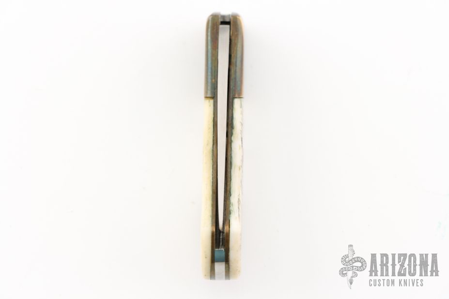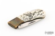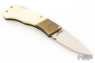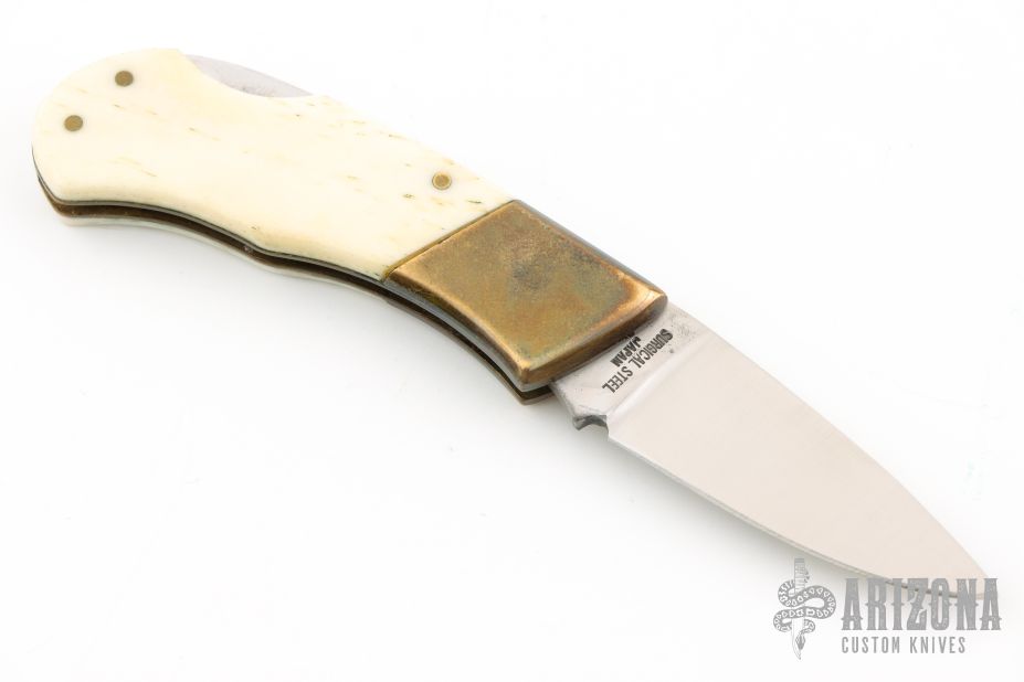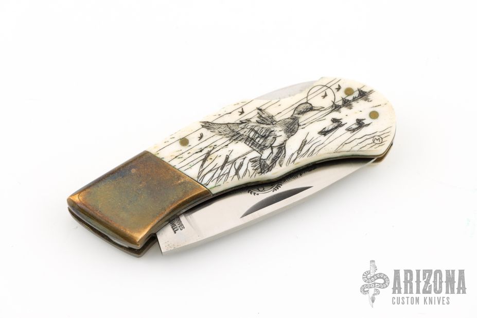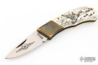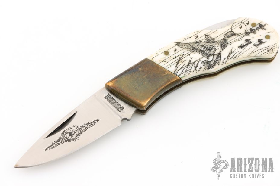 This lockback from Sam McDowell features a surgical steel satin finished blade with nail nick. The handle has brass bolsters with nice scrimshaw on bone scales, brass liners and a stainless steel backspacer. Comes with a leather slip sheath. Has a couple light scratches, otherwise excellent condition.