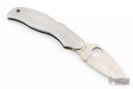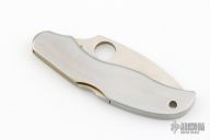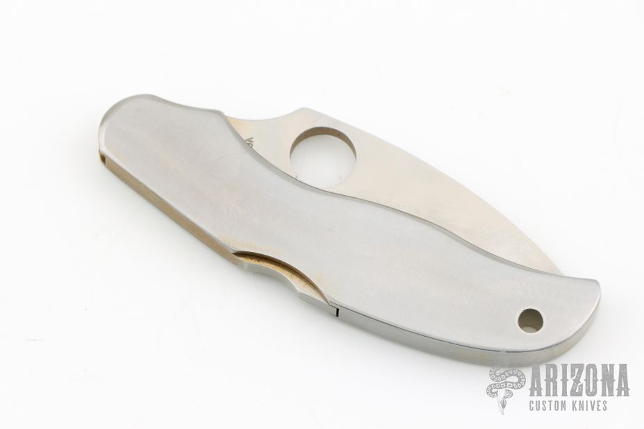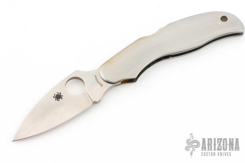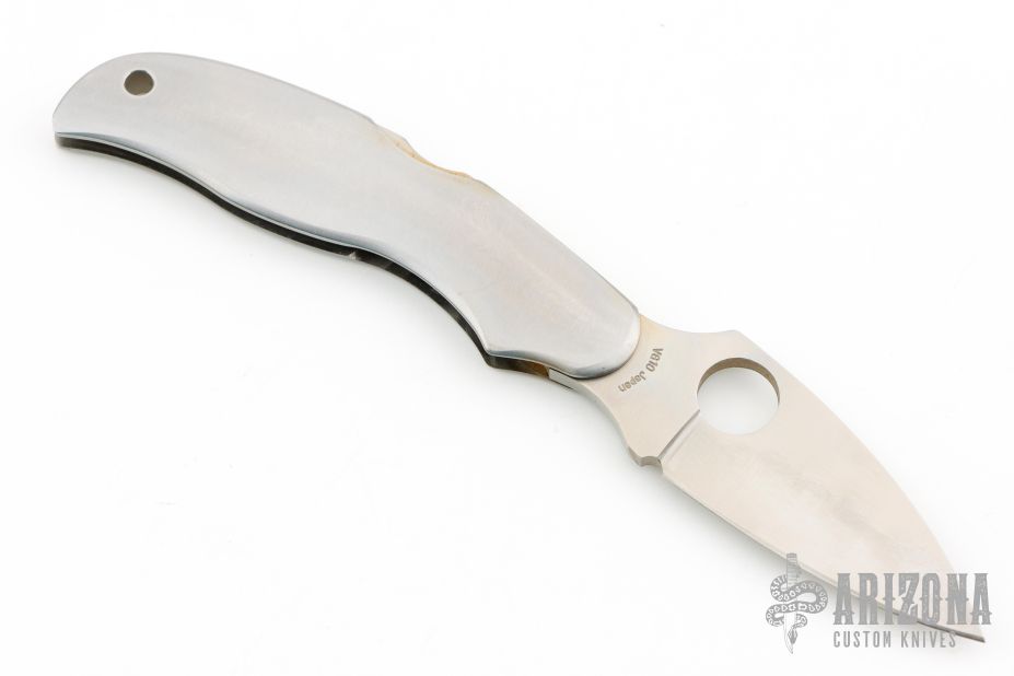 This Kopa by Spyderco features a satin finish VG10 blade. The handle is satin finished steel covers with steel rockerbar. Has some scratches on the covers, otherwise great condition. Discontinued.