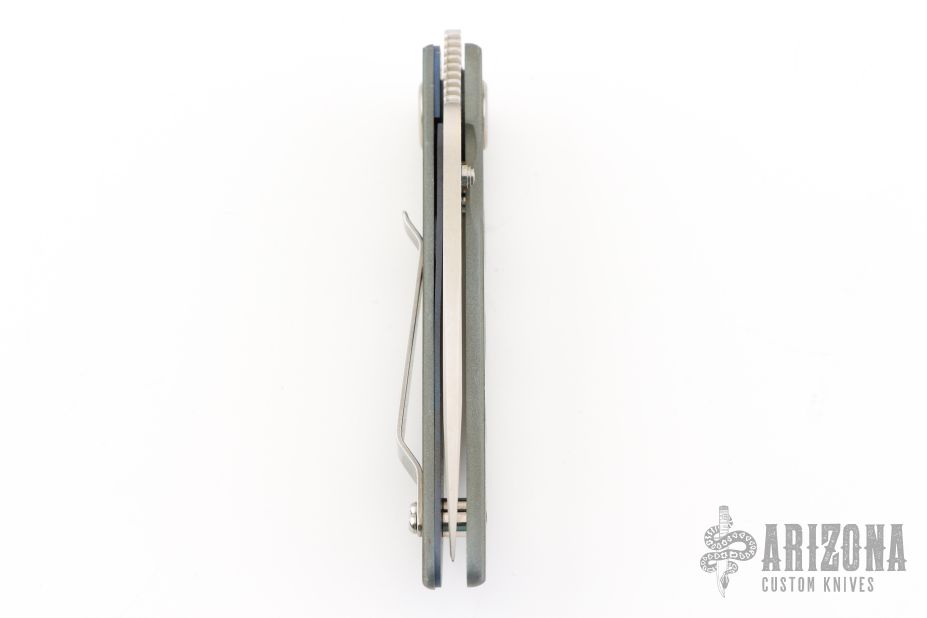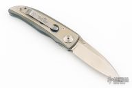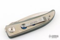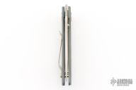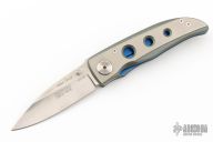 This Michael Walker designed Sarra-C liner lock by Klotzli features a satin/blasted titanium frame with a single anodized titanium liner and a tip up reversible stainless steel clip. Satin finished ATS-34 blade drop point blade with single thumb stud and notched thumbrest. Nice lockup, detent and blade seating. Has some light scratches, otherwise excellent condition.