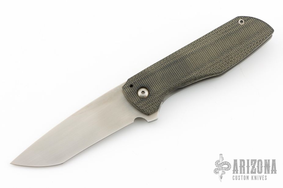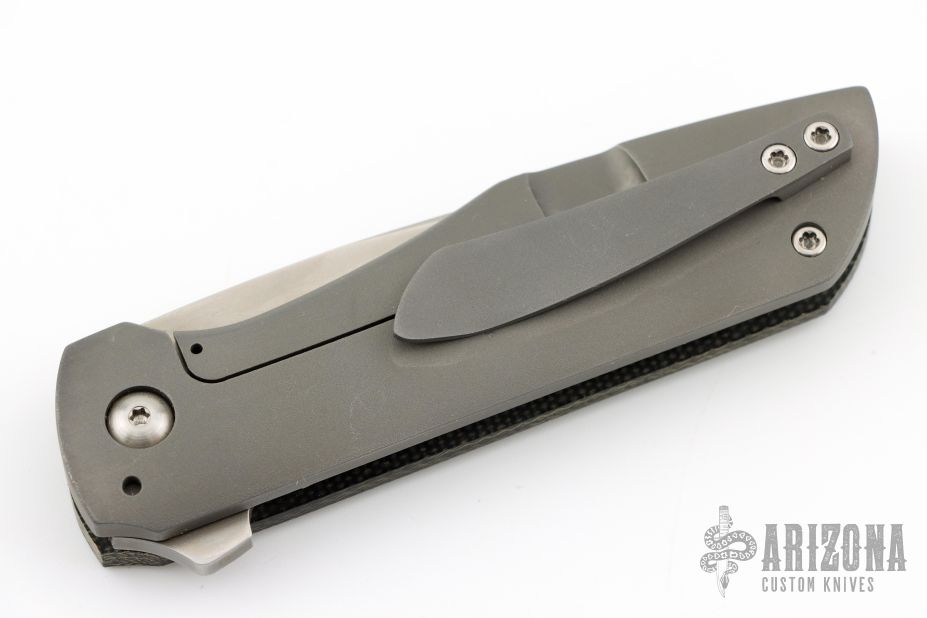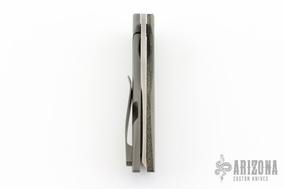 This knife by Jared Price features an acid-etched, chisel-ground blade. The handle has black canvas scales over bead blasted titanium liners. Titanium tip up pocket clip and steel posts. Comes with a COA. Has some scratches on the frame and clip. Great condition otherwise.