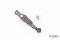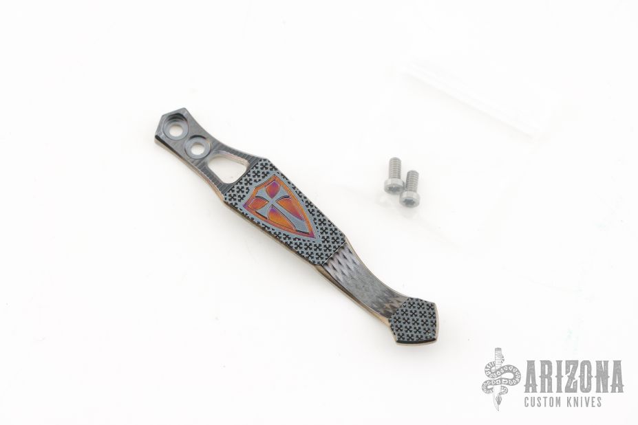 Finish -- Machined titanium clip with laser engraved Steel Flame Crusader artwork given a Vader Crusader treatment.