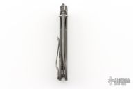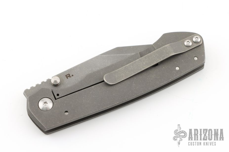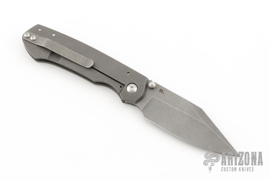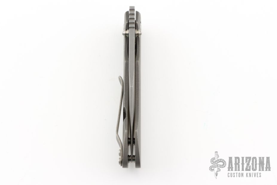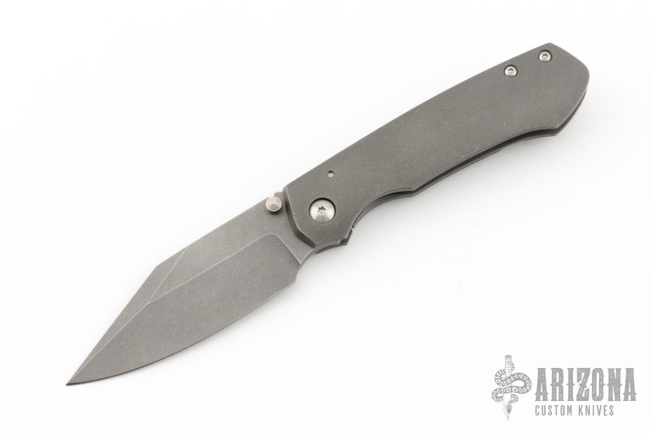 This Custom Framelock by Ray Laconico features an acid/tumble finished blade with dual thumbstuds and a notched thumbrest. The handle has an acid/tumble finished titanium frame with matching tip up clip, satin finished posts. Nice detent, blade seating and lockup. Has some light scuffs, otherwise excellent condition.