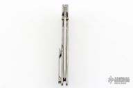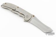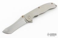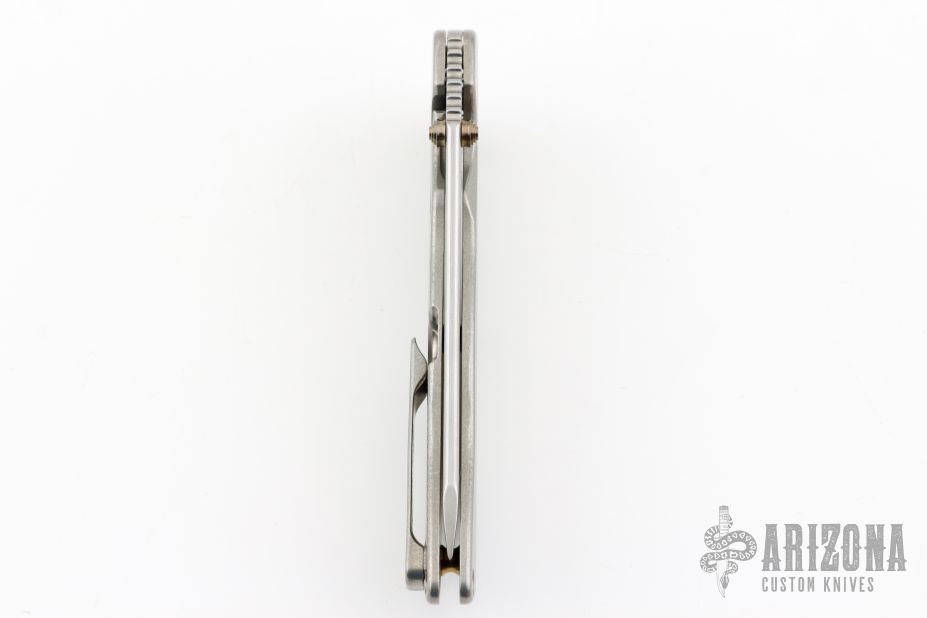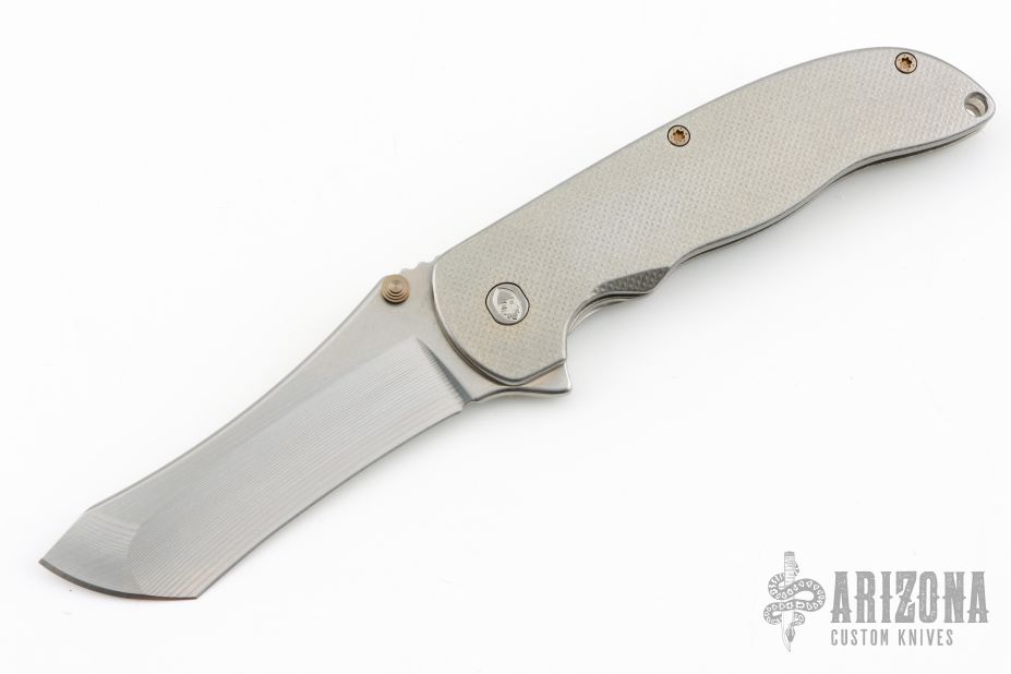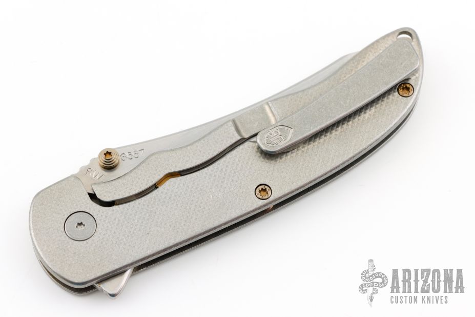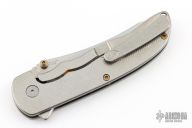This Norseman (#3667) by John Grimsmo features tumble finished milled blade with a single titanium thumb stud, notched thumb ramp and flipper. The handle features tumble finished and crosshatch textured titanium frame with titanium screws. Very smooth action that requires no wrist movement. Nice detent, lockup and blade seating. Rides on ceramic bearings.