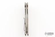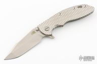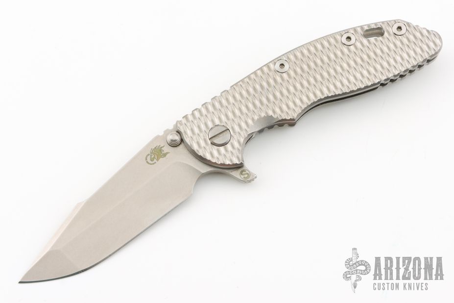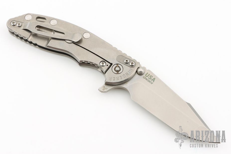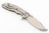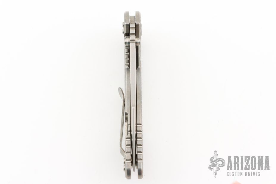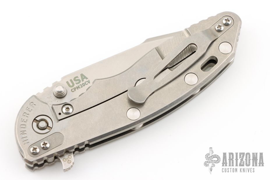 This XM-18 Skinny by Rick Hinderer features a stonewashed blade with notched thumbrest and flipper. The handle has a stonewashed titanium frame with milled titanium scale, and a tip up or down reversible titanium clip, pivot, and filler tab, lanyard hole at the butt. Excellent Condition.