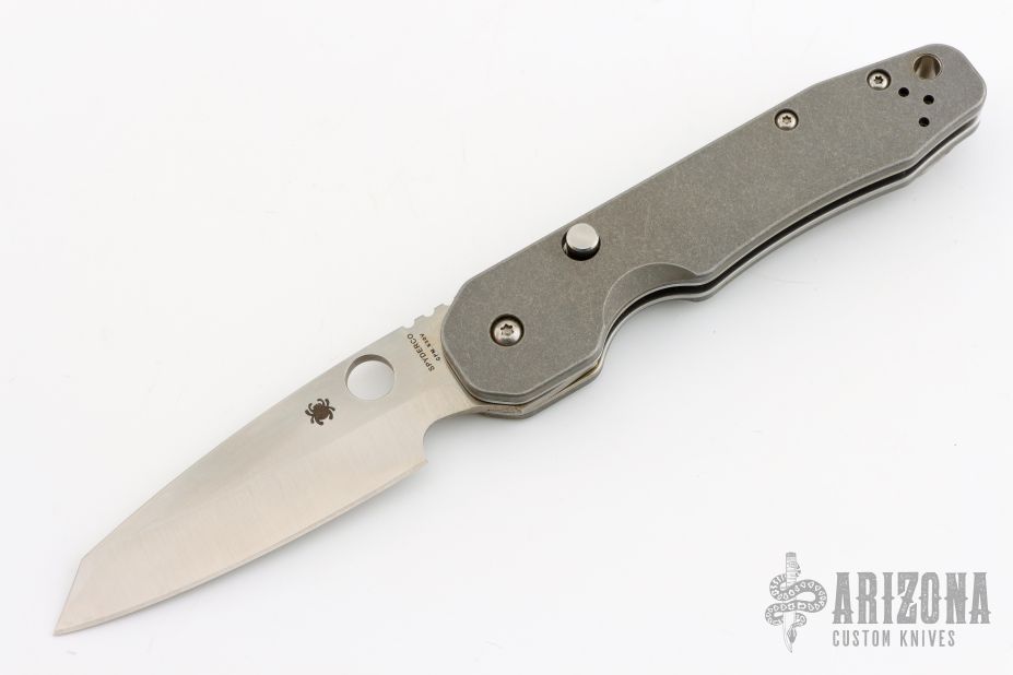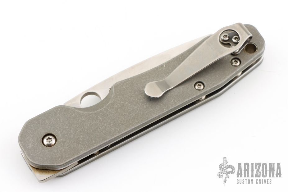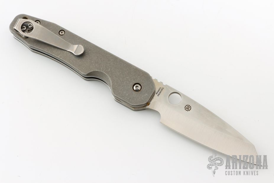 This Smock by Spyderco has a satin finish sheepsfoot style blade. The handle features custom titanium scales over stainless steel liners with a reversible deep carry Lynch NY deep carry titanium pocket tip up pocket clip. Has some scuffs and scratches on the body, great condition otherwise.